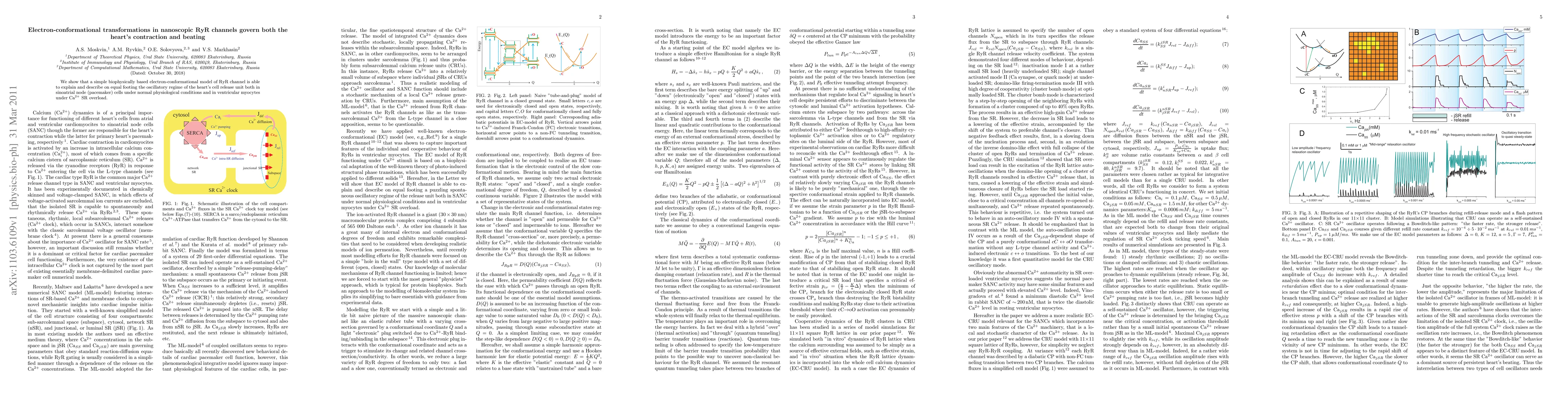 We show that a simple biophysically based electron-conformational model of RyR channel is able to explain and describe on equal footing the oscillatory regime of the heart's cell release unit both in sinoatrial node (pacemaker) cells under normal physiological conditions and in ventricular myocytes under Ca$^{2+}$ SR overload.
