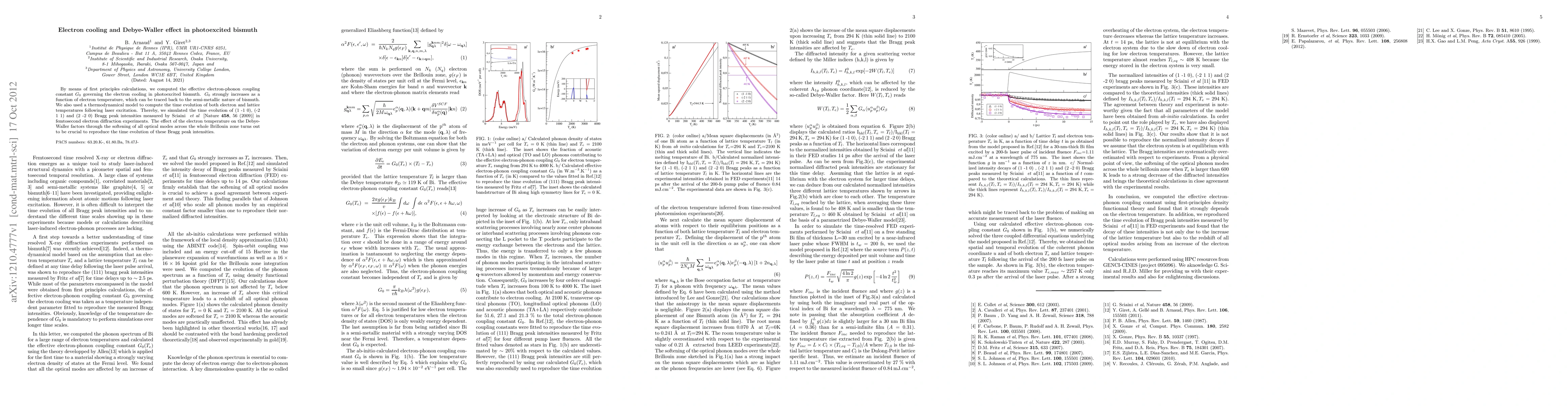 This paper investigates electron cooling and the Debye-Waller effect in photoexcited bismuth using first principles calculations and thermodynamical models. It finds that the electron-phonon coupling constant $G_0$ increases significantly with electron temperature, attributed to bismuth's semi-metallic nature, and highlights the importance of electron temperature on Debye-Waller factors in reproducing experimental Bragg peak intensities.
