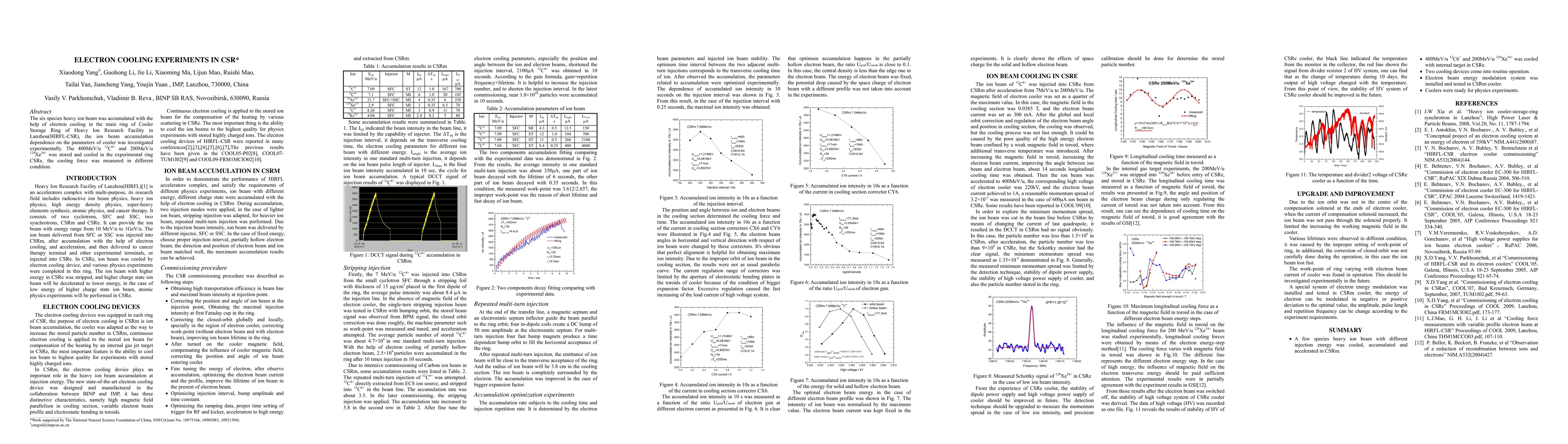 The six species heavy ion beam was accumulated with the help of electron cooling in the main ring of Cooler Storage Ring of Heavy Ion Research Facility in Lanzhou(HIRFL-CSR), the ion beam accumulation dependence on the parameters of cooler was investigated experimentally. The 400MeV/u 12C6+ and 200MeV/u 129Xe54+ was stored and cooled in the experimental ring CSRe, the cooling force was measured in different condition.