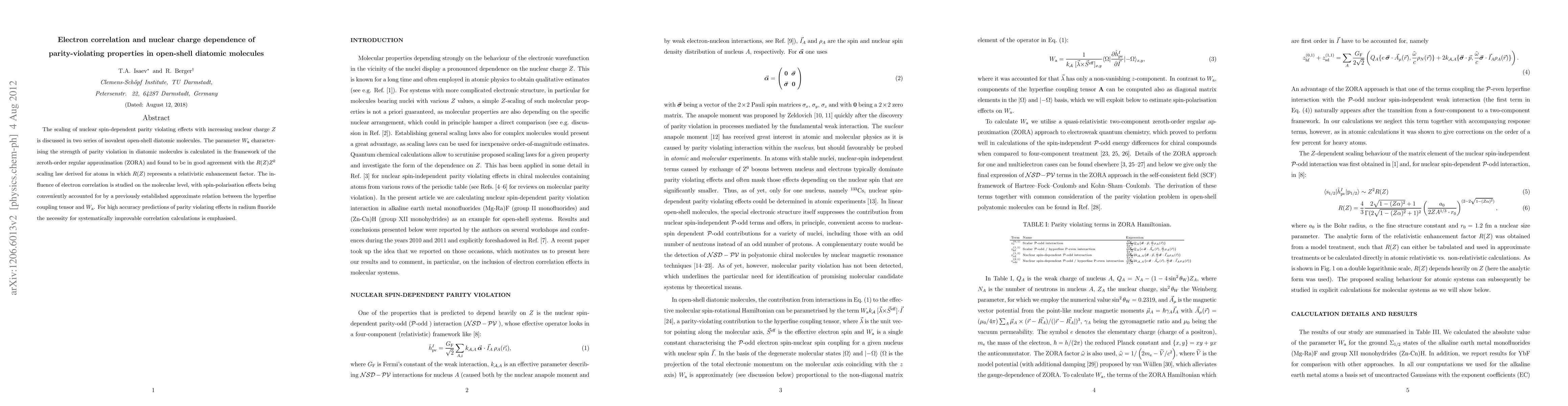 This paper investigates the nuclear charge dependence of parity-violating effects in open-shell diatomic molecules, finding that $W_\mathrm{a}$ scales with $R(Z) Z^k$ in agreement with atomic models. Electron correlation effects are analyzed, emphasizing the need for improved calculations for high-accuracy predictions in radium fluoride.
