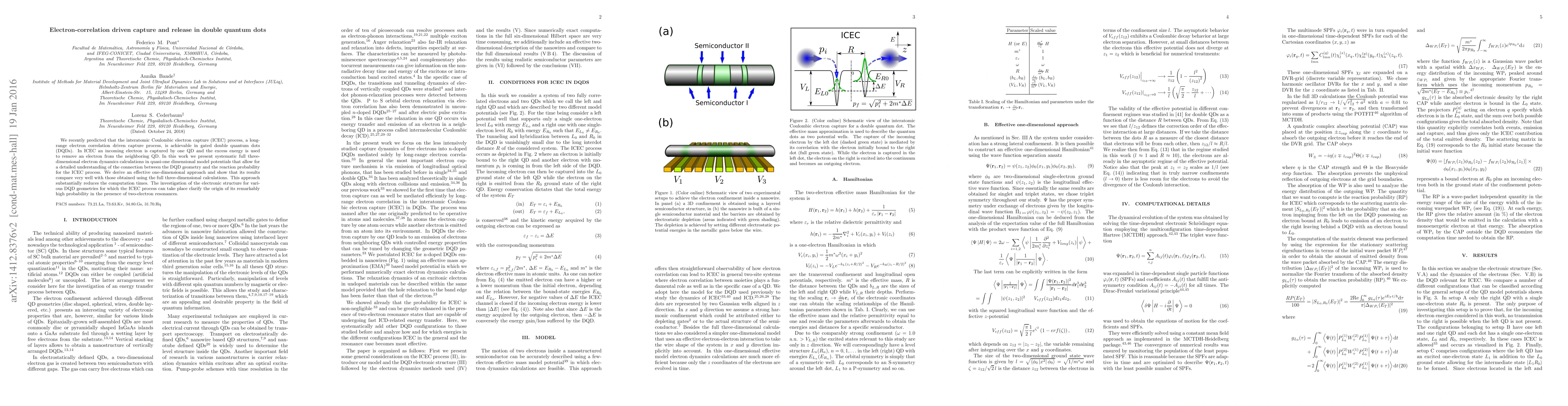 We recently predicted that the interatomic Coulombic electron capture (ICEC) process, a long-range electron correlation driven capture process, is achievable in gated double quantum dots (DQDs). In ICEC an incoming electron is captured by one QD and the excess energy is used to remove an electron from the neighboring QD. In this work we present systematic full three-dimensional electron dynamics calculations in quasi-one dimensional model potentials that allow for a detailed understanding of the connection between the DQD geometry and the reaction probability for the ICEC process. We derive an effective one-dimensional approach and show that its results compare very well with those obtained using the full three-dimensional calculations. This approach substantially reduces the computation times. The investigation of the electronic structure for various DQD geometries for which the ICEC process can take place clarify the origin of its remarkably high probability in the presence of two-electron resonances.