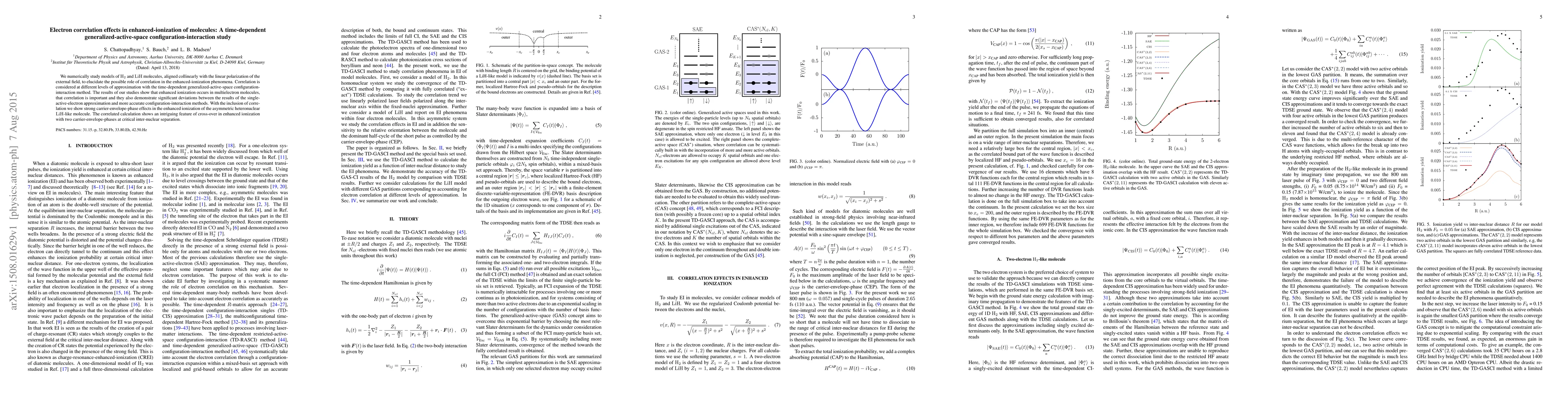 We numerically study models of $\mathrm{H}_2$ and $\mathrm{LiH}$ molecules, aligned collinearly with the linear polarization of the external field, to elucidate the possible role of correlation in the enhanced-ionization phenomena. Correlation is considered at different levels of approximation with the time-dependent generalized-active-space configuration-interaction method. The results of our studies show that enhanced ionization occurs in multielectron molecules, that correlation is important and they also demonstrate significant deviations between the results of the single-active-electron approximation and more accurate configuration-interaction methods. With the inclusion of correlation we show strong carrier-envelope-phase effects in the enhanced ionization of the asymmetric heteronuclear $\mathrm{LiH}$-like molecule. The correlated calculation shows an intriguing feature of cross-over in enhanced ionization with two carrier-envelope-phases at critical inter-nuclear separation.