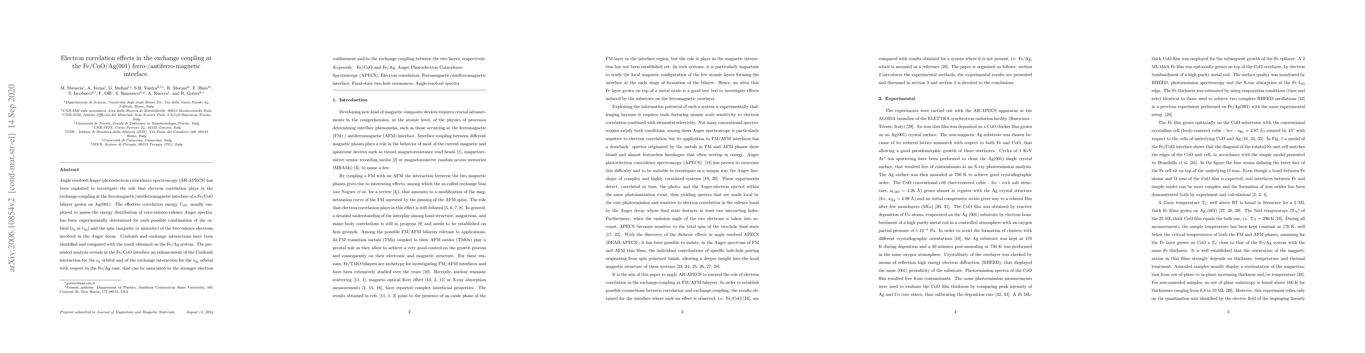 Angle resolved-Auger-photoelectron coincidence spectroscopy (AR-APECS) has been exploited to investigate the role that electron correlation plays in the exchange-coupling at the ferromagnetic/antiferromagnetic interface of a Fe/CoO bilayer growth on Ag(001). The effective correlation energy U$_{\textrm{eff}}$, usually employed to assess the energy distribution of core-valence-valence Auger spectra, has been experimentally determined for each possible combination of the orbital (e$_g$ or t$_{2g}$) and the spin (majority or minority) of the two valence electrons involved in the Auger decay. Coulomb and exchange interactions have been identified and compared with the result obtained on the Fe/Ag system. The presented analysis reveals in the Fe/CoO interface an enhancement of the Coulomb interaction for the e$_g$ orbital and of the exchange interaction for the t$_{2g}$ orbital with respect to the Fe/Ag case that can be associated to the stronger electron confinement and to the exchange coupling between the two layers, respectively.