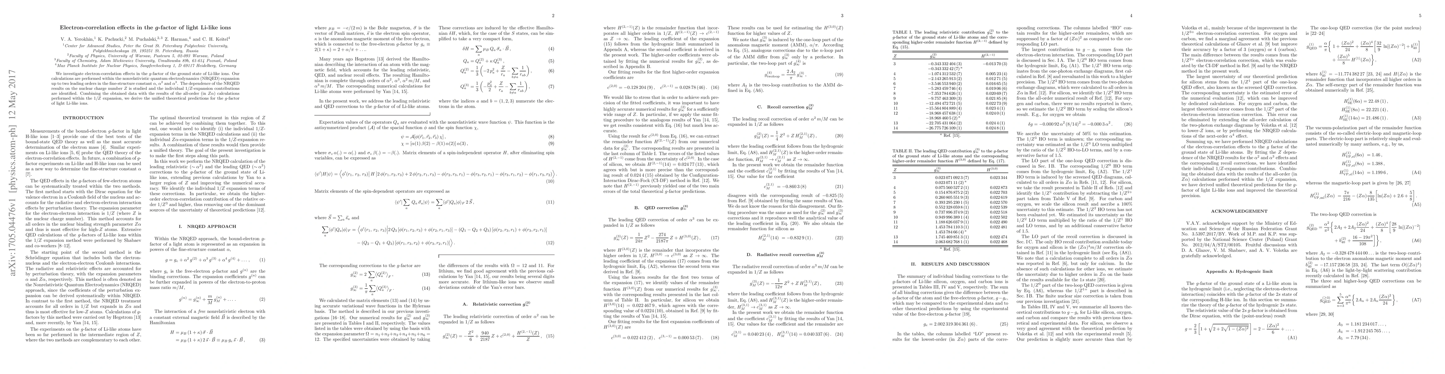 We investigate electron-correlation effects in the $g$-factor of the ground state of Li-like ions. Our calculations are performed within the nonrelativistic quantum electrodynamics (NRQED) expansion up to two leading orders in the fine-structure constant $\alpha$, $\alpha^2$ and $\alpha^3$. The dependence of the NRQED results on the nuclear charge number $Z$ is studied and the individual $1/Z$-expansion contributions are identified. Combining the obtained data with the results of the all-order (in $Z\alpha$) calculations performed within the $1/Z$ expansion, we derive the unified theoretical predictions for the $g$-factor of light Li-like ions.
