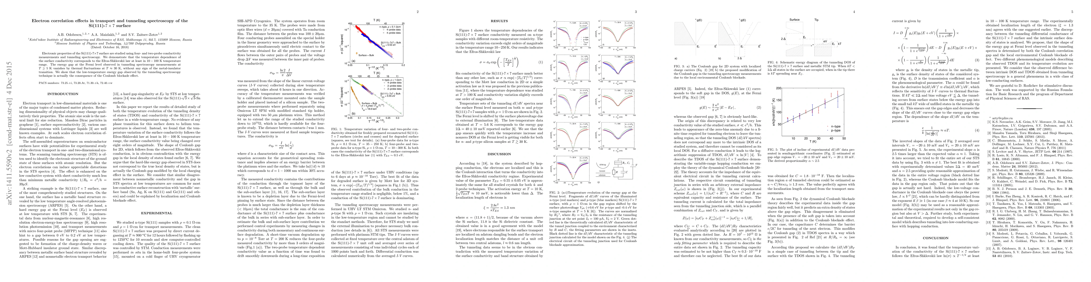 This paper investigates electron correlation effects in the Si(111)-$7\times 7$ surface using transport and tunneling spectroscopy, showing that the temperature dependence of surface conductivity follows the Efros-Shklovskii law and that the low-temperature energy gap observed in tunneling measurements is due to the Coulomb blockade effect rather than a metal-insulator transition.