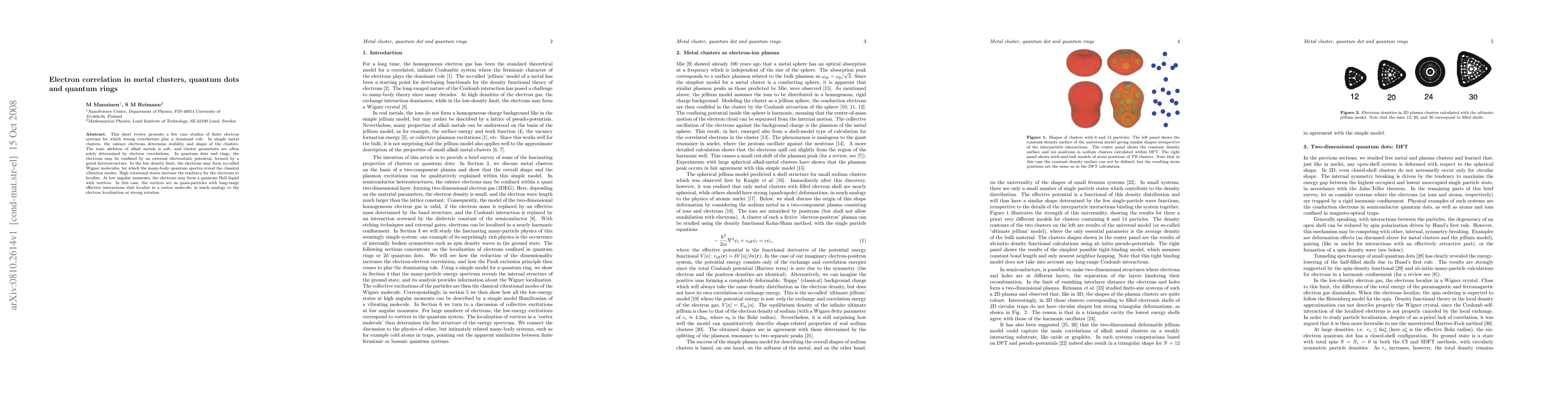 This review examines the role of electron correlation in metal clusters, quantum dots, and quantum rings, highlighting how strong correlations dictate the stability and shape of clusters, and how confinement in quantum dots and rings can lead to phenomena like Wigner molecules and quantum Hall liquids with vortex quasi-particles.