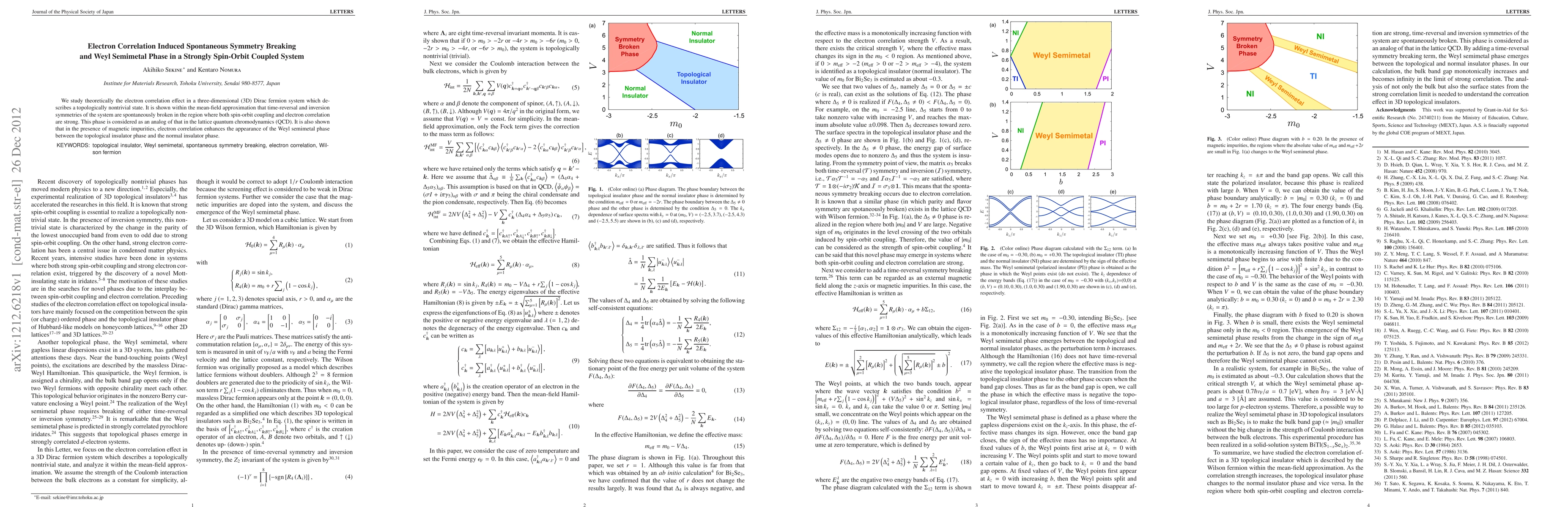We study theoretically the electron correlation effect in a three-dimensional Dirac fermion system which describes a topologically nontrivial state. It is shown within the mean-field approximation that time-reversal and inversion symmetries of the system are spontaneously broken in the region where both spin-orbit coupling and electron correlation are strong. This phase is considered as an analog of that in the lattice quantum chromodynamics. It is also shown that in the presence of magnetic impurities, electron correlation enhances the appearance of the Weyl semimetal phase between the topological insulator phase and the normal insulator phase.