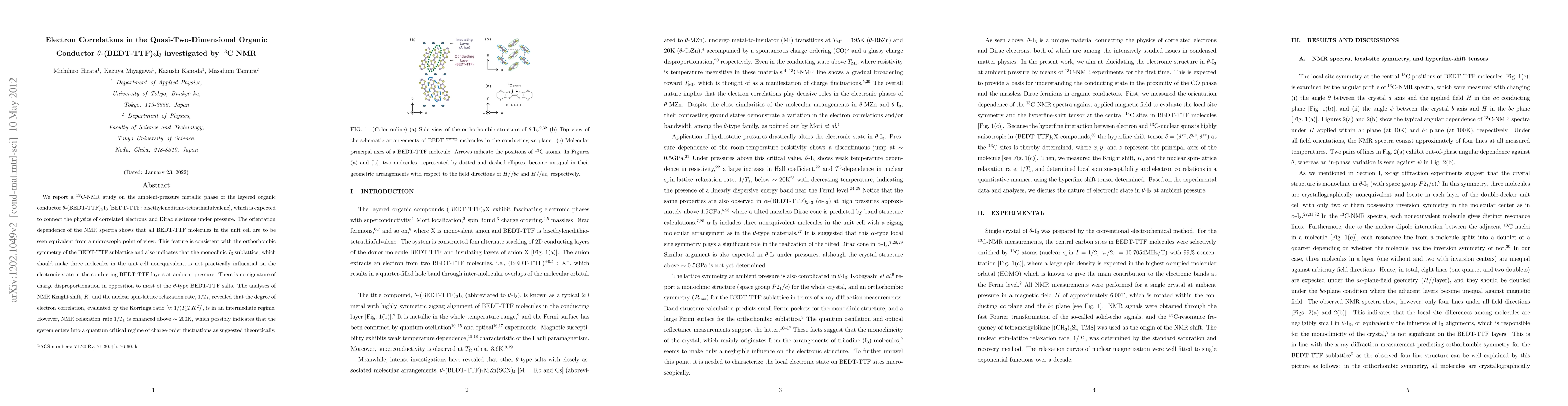 The research uses $^{13}$C NMR to study the quasi-two-dimensional organic conductor $ heta$-(BEDT-TTF)$_{2}$I$_{3}$. It reveals that BEDT-TTF molecules in the unit cell are equivalent, suggesting the monoclinic I$_3$ sublattice has minimal influence on electronic states at ambient pressure. The study finds an intermediate electron correlation regime, with enhanced NMR relaxation rate above ~200K, hinting at quantum critical charge-order fluctuations.