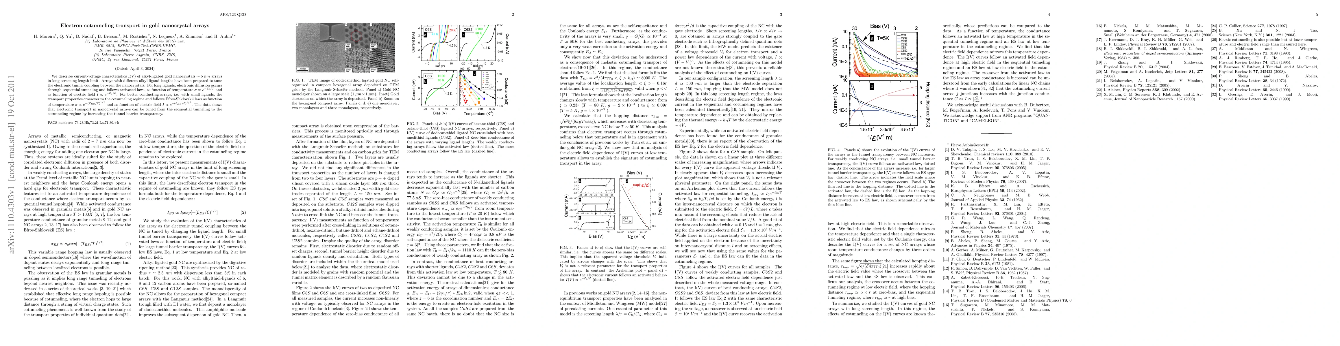 This paper investigates electron transport in gold nanocrystal arrays with varying alkyl ligand lengths, revealing a transition from sequential tunneling to cotunneling as the ligand length decreases. The transport behavior changes from activated laws to Efros-Shklovskii laws, demonstrating tunable electronic transport properties in nanocrystals.