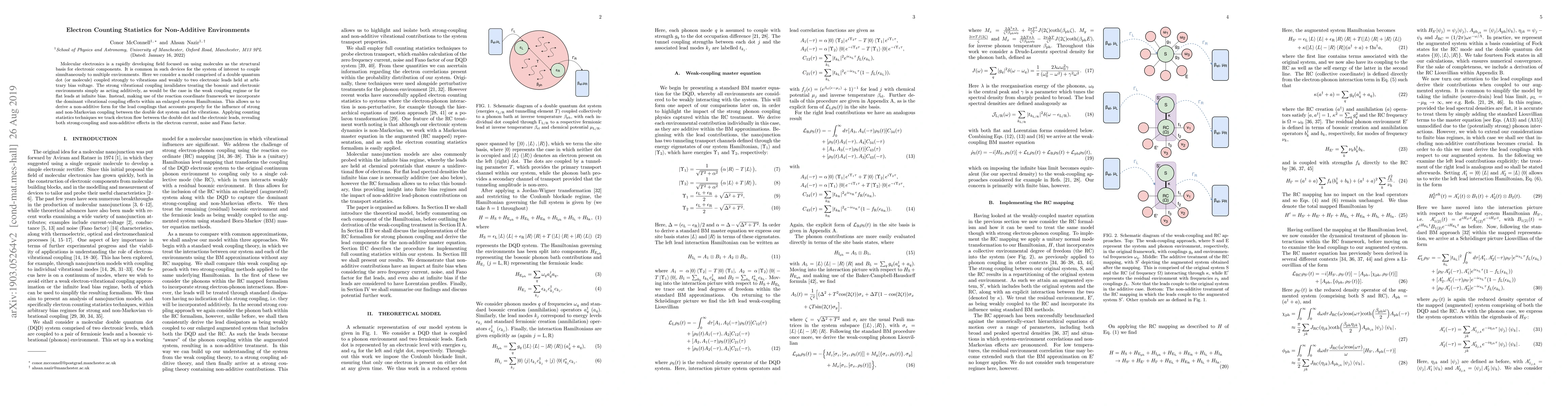 Molecular electronics is a rapidly developing field focused on using molecules as the structural basis for electronic components. It is common in such devices for the system of interest to couple simultaneously to multiple environments. Here we consider a model comprised of a double quantum dot (or molecule) coupled strongly to vibrations and weakly to two electronic leads held at arbitrary bias voltage. The strong vibrational coupling invalidates treating the bosonic and electronic environments simply as acting additively, as would be the case in the weak coupling regime or for flat leads at infinite bias. Instead, making use of the reaction coordinate framework we incorporate the dominant vibrational coupling effects within an enlarged system Hamiltonian. This allows us to derive a non-additive form for the lead couplings that accounts properly for the influence of strong and non-Markovian coupling between the double dot system and the vibrations. Applying counting statistics techniques we track electron flow between the double dot and the electronic leads, revealing both strong-coupling and non-additive effects in the electron current, noise and Fano factor.