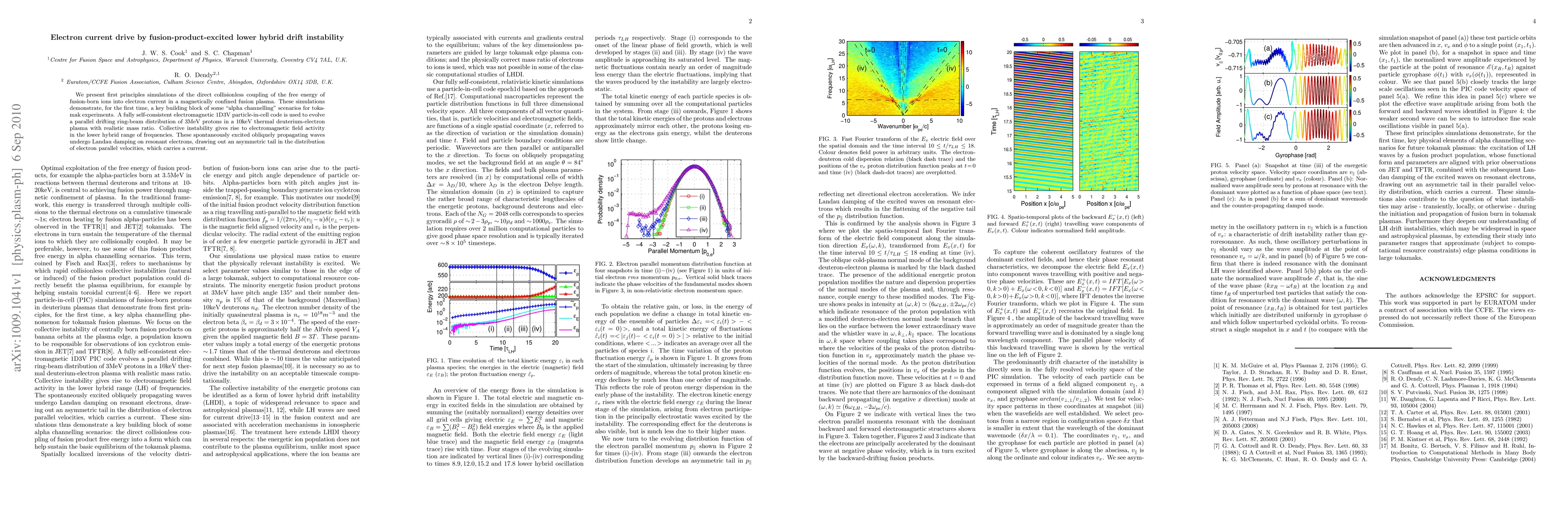 This paper presents simulations showing how fusion-born ions can drive electron current in fusion plasmas via a lower hybrid drift instability, providing a foundational mechanism for "alpha channelling" in tokamak experiments. The study uses a self-consistent electromagnetic particle-in-cell code to demonstrate that these instabilities excite waves that Landau damp on electrons, generating an electron current.