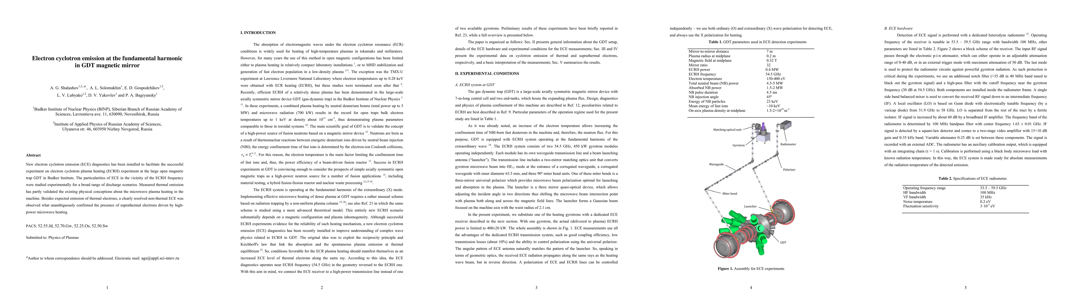 This paper reports on experiments measuring electron cyclotron emission (ECE) at the fundamental harmonic in the GDT magnetic mirror, revealing both thermal and non-thermal ECE, indicating the presence of suprathermal electrons due to high-power microwave heating. New diagnostics were employed to facilitate these observations.