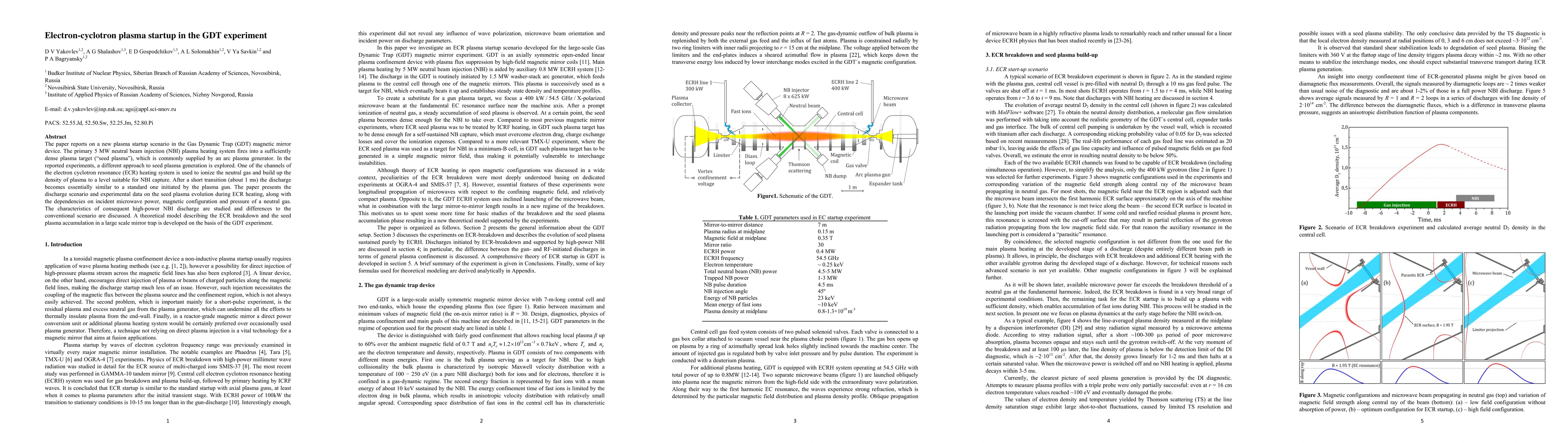 The paper reports on a new plasma startup scenario in the Gas Dynamic Trap (GDT) magnetic mirror device. The primary 5 MW neutral beam injection (NBI) plasma heating system fires into a sufficiently dense plasma target ("seed plasma"), which is commonly supplied by an arc plasma generator. In the reported experiments, a different approach to seed plasma generation is explored. One of the channels of the electron cyclotron resonance (ECR) heating system is used to ionize the neutral gas and build up the density of plasma to a level suitable for NBI capture. After a short transition (about 1 ms) the discharge becomes essentially similar to a standard one initiated by the plasma gun. The paper presents the discharge scenario and experimental data on the seed plasma evolution during ECR heating, along with the dependencies on incident microwave power, magnetic configuration and pressure of a neutral gas. The characteristics of consequent high-power NBI discharge are studied and differences to the conventional scenario are discussed. A theoretical model describing the ECR breakdown and the seed plasma accumulation in a large scale mirror trap is developed on the basis of the GDT experiment.