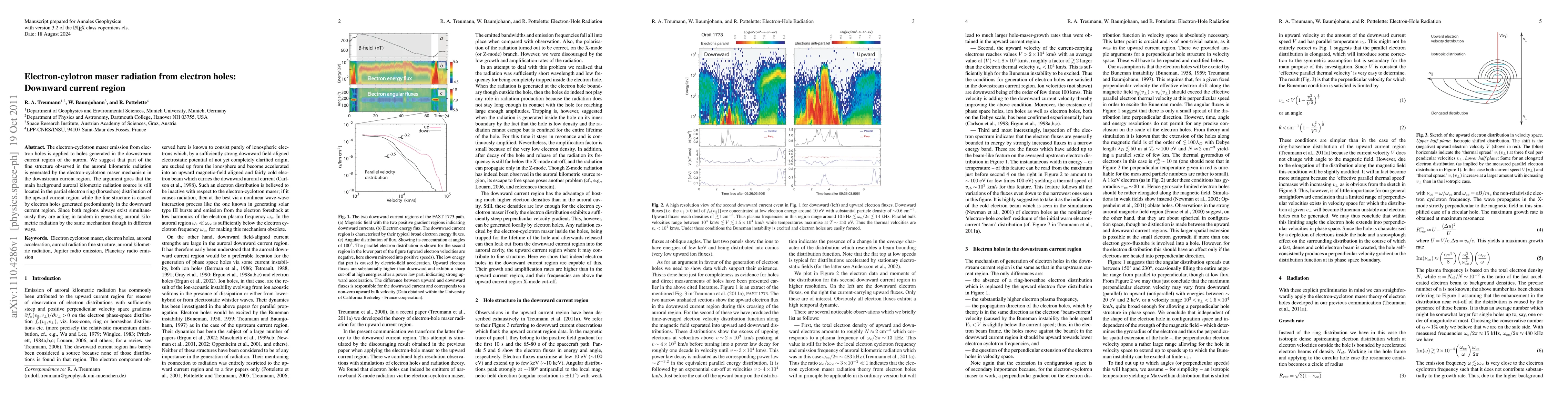 This paper explores the electron-cyclotron maser emission from electron holes in the downstream current region of the aurora, suggesting that fine structure in auroral kilometric radiation is generated by this mechanism. It posits that while the main auroral kilometric radiation originates from the upward current region, the fine structure is caused by electron holes in the downward current region, both regions working together to generate auroral kilometric radiation.