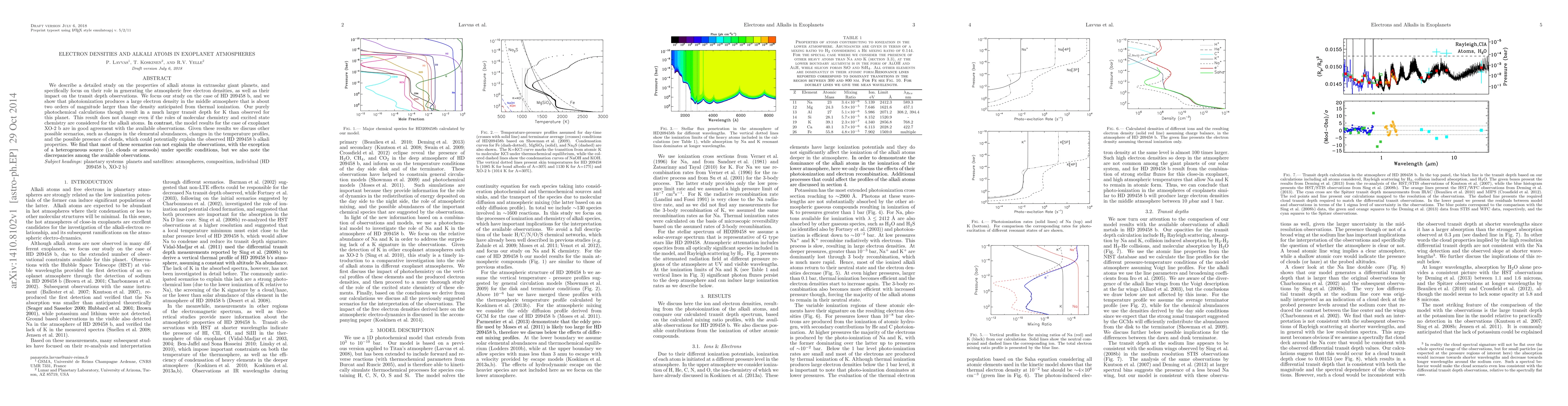 The study examines alkali atoms in exoplanet atmospheres, focusing on HD 209458 b, revealing that photoionization generates substantial electron densities unexplained by thermal ionization. Despite considering molecular and excited state chemistry, models overestimate potassium transit depth observations. The research suggests that a heterogeneous source, like clouds or aerosols, under specific conditions, might reconcile observed discrepancies, while other scenarios like altered abundances or temperature profiles are less likely.