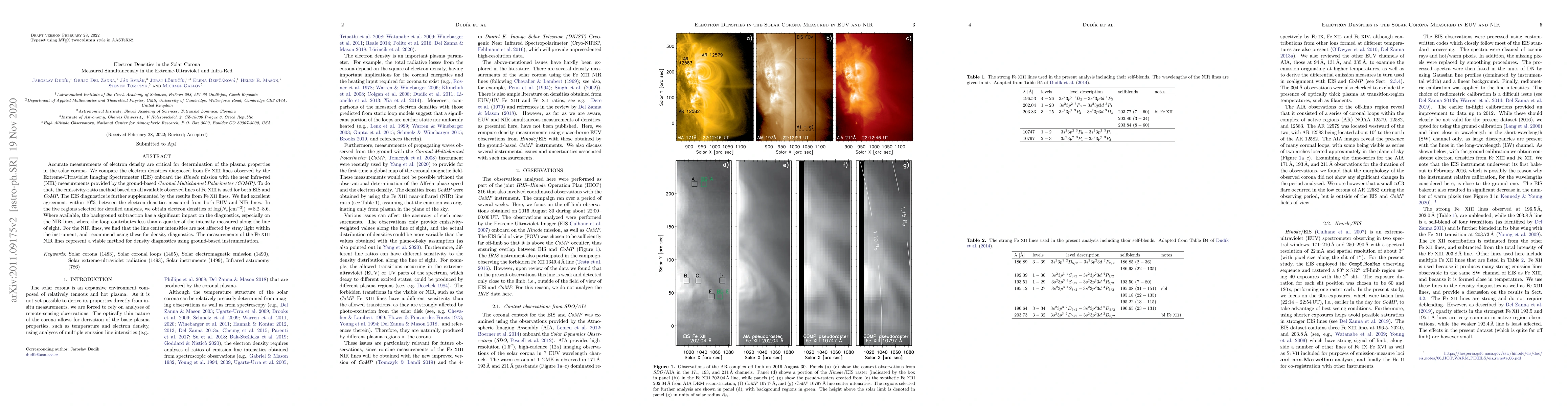 This research compares electron density measurements in the solar corona using EUV from Hinode's EIS and NIR from ground-based COMP. Findings show excellent agreement (within 10%) between the methods, validating ground-based NIR diagnostics for coronal plasma properties.