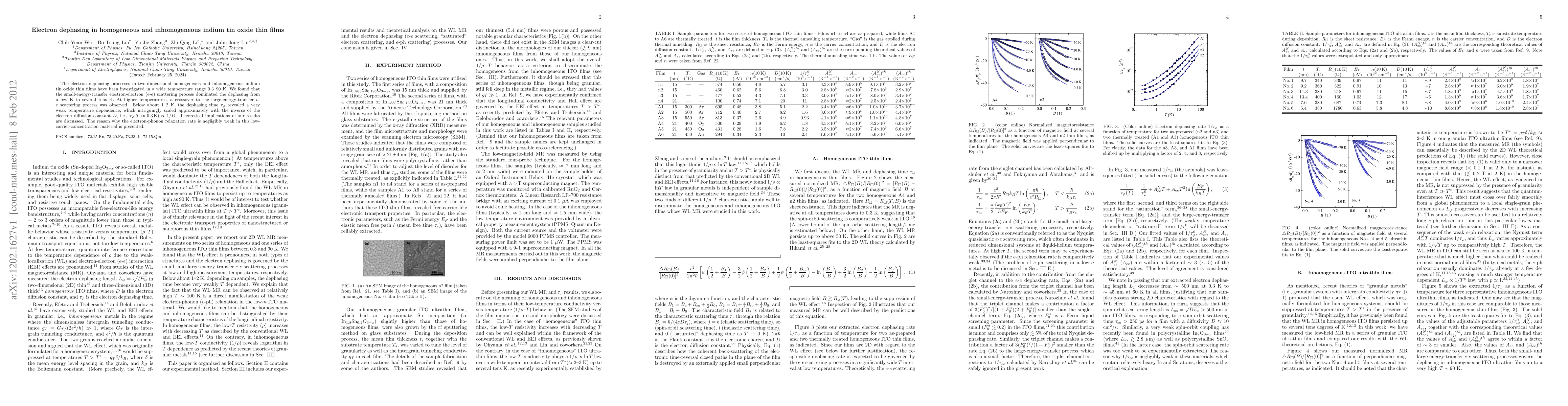 The research investigates electron dephasing in homogeneous and inhomogeneous indium tin oxide thin films across a temperature range of 0.3--90 K, revealing that small-energy-transfer electron-electron scattering dominates dephasing at intermediate temperatures, while at lower temperatures, dephasing time scales inversely with the electron diffusion constant.