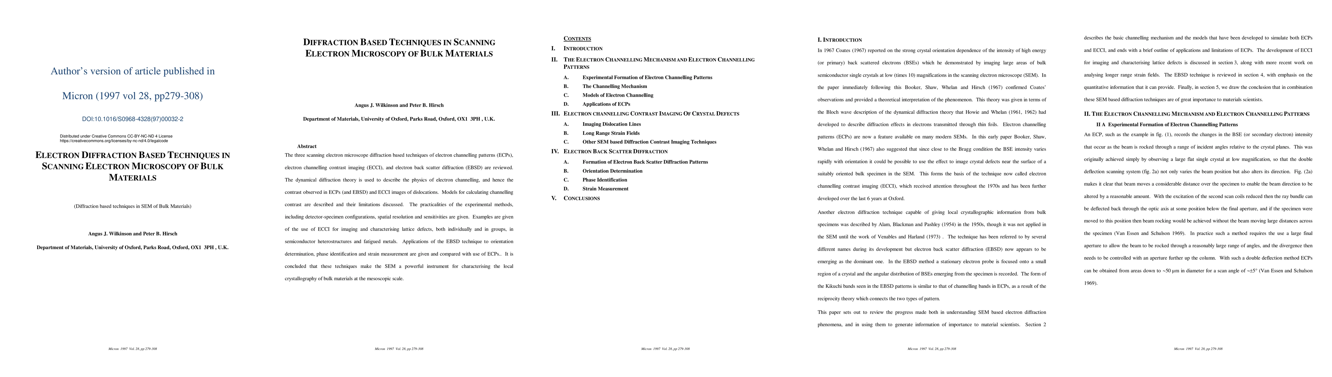 This paper reviews electron diffraction techniques in scanning electron microscopy, including electron channelling patterns, electron channelling contrast imaging, and electron backscatter diffraction. It discusses the physics of electron channelling and the practicalities of these techniques, highlighting their applications in imaging and characterizing lattice defects and crystallography in materials.