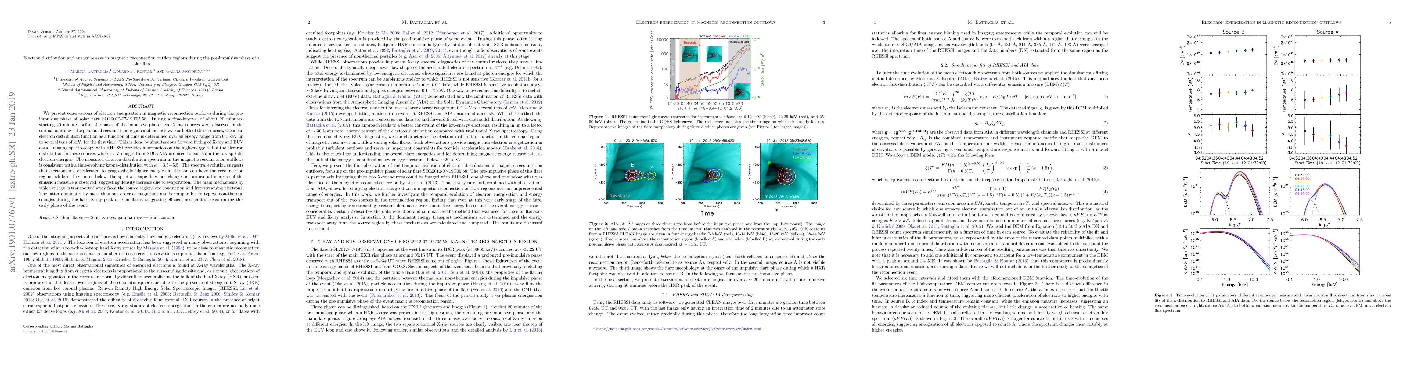 This study observes electron energization in magnetic reconnection outflows during the pre-impulsive phase of solar flare SOL2012-07-19T05:58, revealing a time-evolving kappa-distribution. Free-streaming electrons dominate energy transport, indicating efficient acceleration even before the flare's peak.