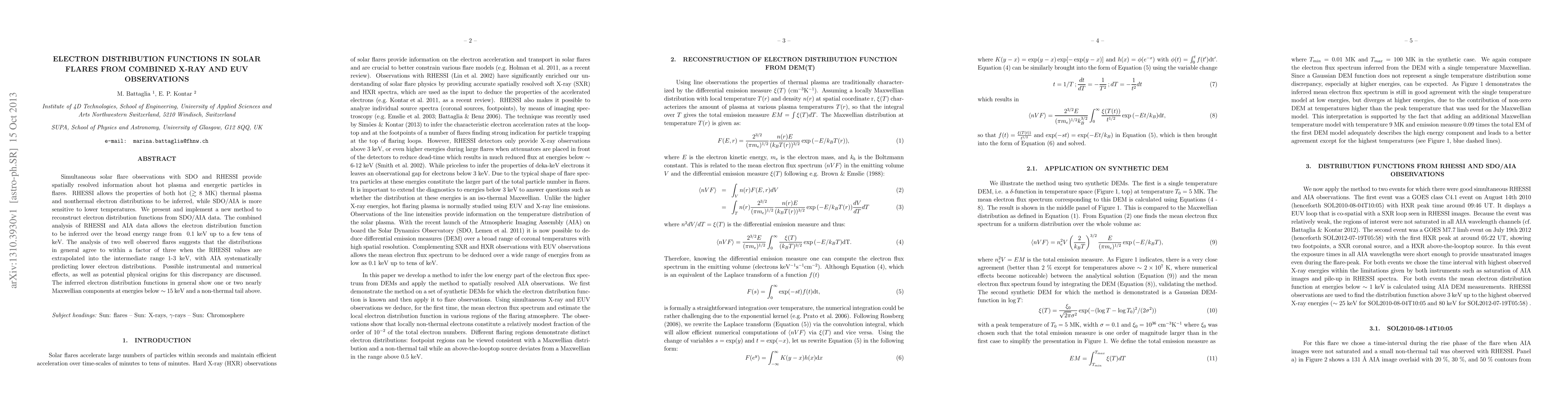 This paper presents a new method to reconstruct electron distribution functions in solar flares using combined X-ray and EUV observations from SDO/AIA and RHESSI. The analysis of two flares shows agreement between RHESSI and AIA data within a factor of three, though AIA predicts lower electron distributions, with potential instrumental and physical explanations for the discrepancy.
