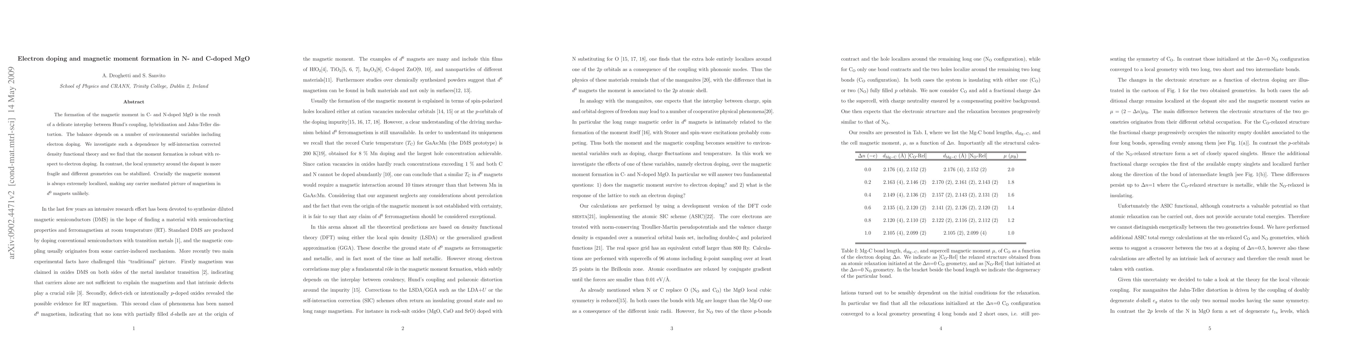 The formation of the magnetic moment in C- and N-doped MgO is the result of a delicate interplay between Hund's coupling, hybridization and Jahn-Teller distortion. The balance depends on a number of environmental variables including electron doping. We investigate such a dependence by self-interaction corrected density functional theory and we find that the moment formation is robust with respect to electron doping. In contrast, the local symmetry around the dopant is more fragile and two different geometries can be stabilized. Crucially the magnetic moment is always extremely localized, making any carrier mediated picture of magnetism in d^0 magnets unlikely.