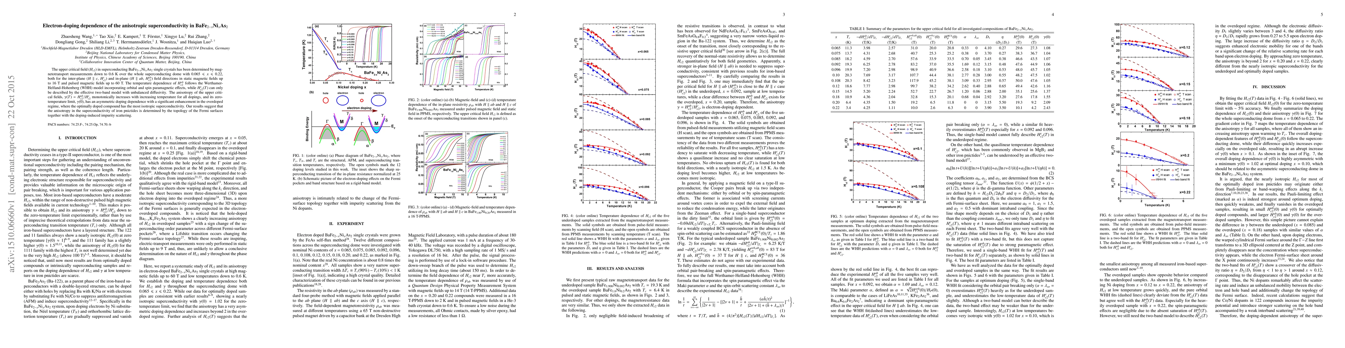 The upper critical field ($H_{c2}$) in superconducting BaFe$_{2-x}$Ni$_{x}$As$_2$ single crystals has been determined by magnetotransport measurements down to 0.6 K over the whole superconducting dome with $0.065 \leqslant x \leqslant 0.22$, both for the inter-plane ($H \parallel c$, $H_{c2}^{c}$) and in-plane ($H \parallel ab$, $H_{c2}^{ab}$) field directions in static magnetic fields up to 16 T and pulsed magnetic fields up to 60 T. The temperature dependence of $H_{c2}^{ab}$ follows the Werthamer-Helfand-Hohenberg (WHH) model incorporating orbital and spin paramagnetic effects, while $H_{c2}^{c}(T)$ can only be described by the effective two-band model with unbalanced diffusivity. The anisotropy of the upper critical fields, $\gamma (T)=H_{c2}^{ab}/H_{c2}^{c}$ monotonically increases with increasing temperature for all dopings, and its zero-temperature limit, $\gamma (0)$, has an asymmetric doping dependence with a significant enhancement in the overdoped regime, where the optimally doped compound has the most isotropic superconductivity. Our results suggest that the anisotropy in the superconductivity of iron pnictides is determined by the topology of the Fermi surfaces together with the doping-induced impurity scattering.