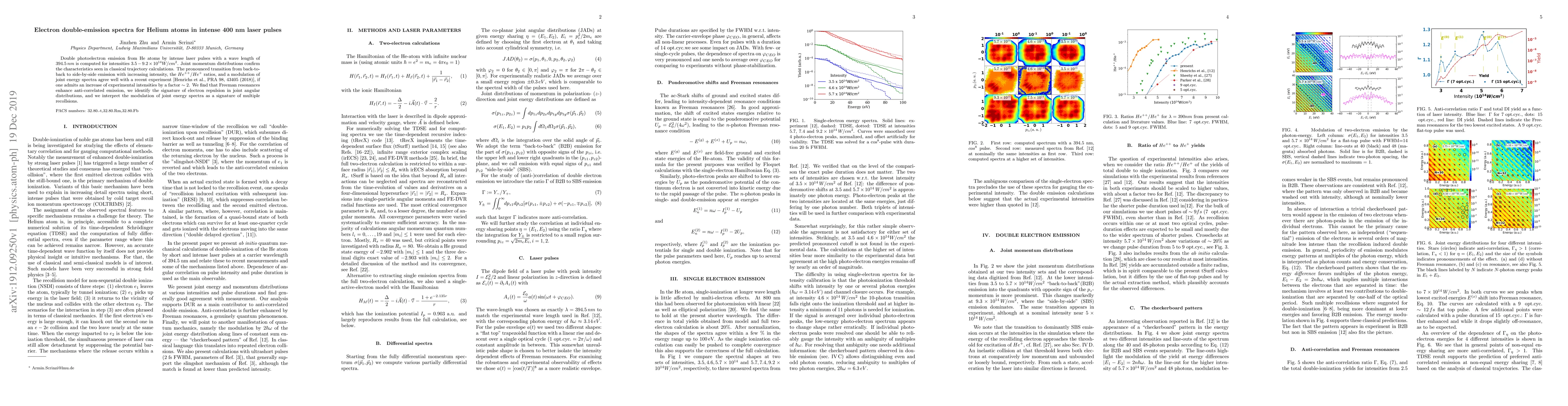 This study computes double photoelectron emission from Helium atoms using intense 400 nm laser pulses, confirming classical trajectory calculations. Key findings include a transition from back-to-back to side-by-side emission with intensity increase, agreement with experimental results after intensity adjustment, and identification of Freeman resonances, electron repulsion, and multiple recollisions as influencing factors in the emission spectra.