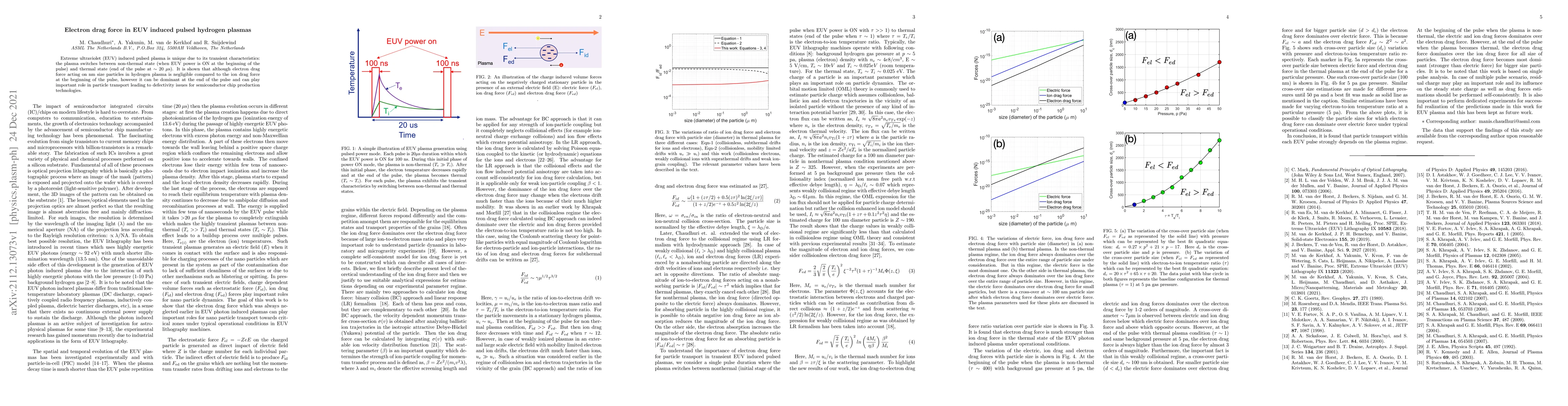 This study investigates the electron drag force in EUV-induced pulsed hydrogen plasmas, revealing its negligible effect at the start of the pulse but its dominance towards the end, significantly impacting particle transport and semiconductor manufacturing.