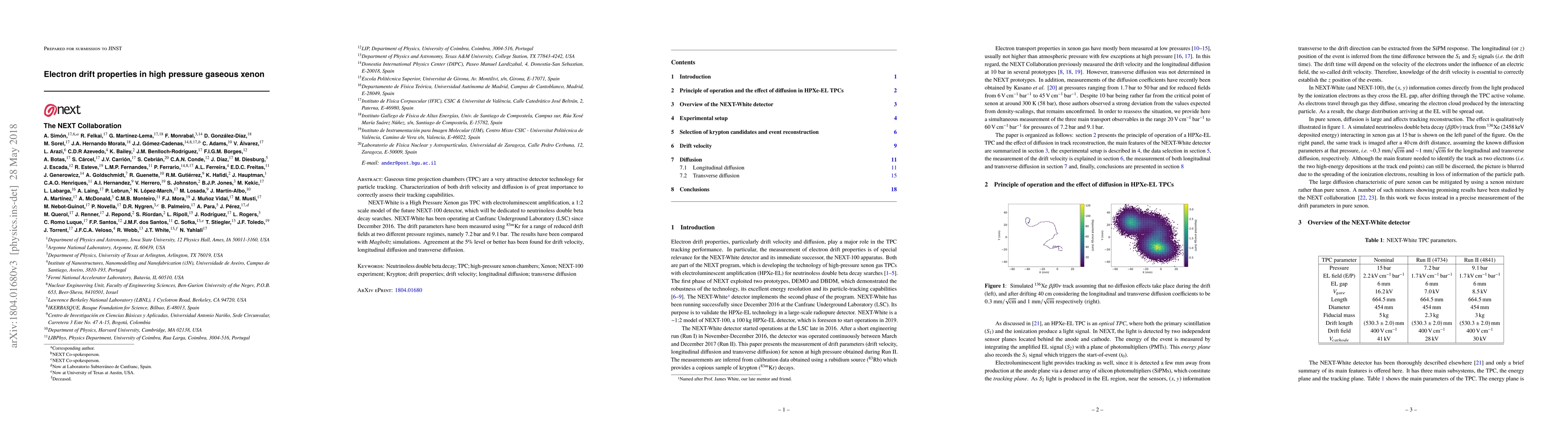 Gaseous time projection chambers (TPC) are a very attractive detector technology for particle tracking. Characterization of both drift velocity and diffusion is of great importance to correctly assess their tracking capabilities. NEXT-White is a High Pressure Xenon gas TPC with electroluminescent amplification, a 1:2 scale model of the future NEXT-100 detector, which will be dedicated to neutrinoless double beta decay searches. NEXT-White has been operating at Canfranc Underground Laboratory (LSC) since December 2016. The drift parameters have been measured using $^{83m}$Kr for a range of reduced drift fields at two different pressure regimes, namely 7.2 bar and 9.1 bar. The results have been compared with Magboltz simulations. Agreement at the 5% level or better has been found for drift velocity, longitudinal diffusion and transverse diffusion.