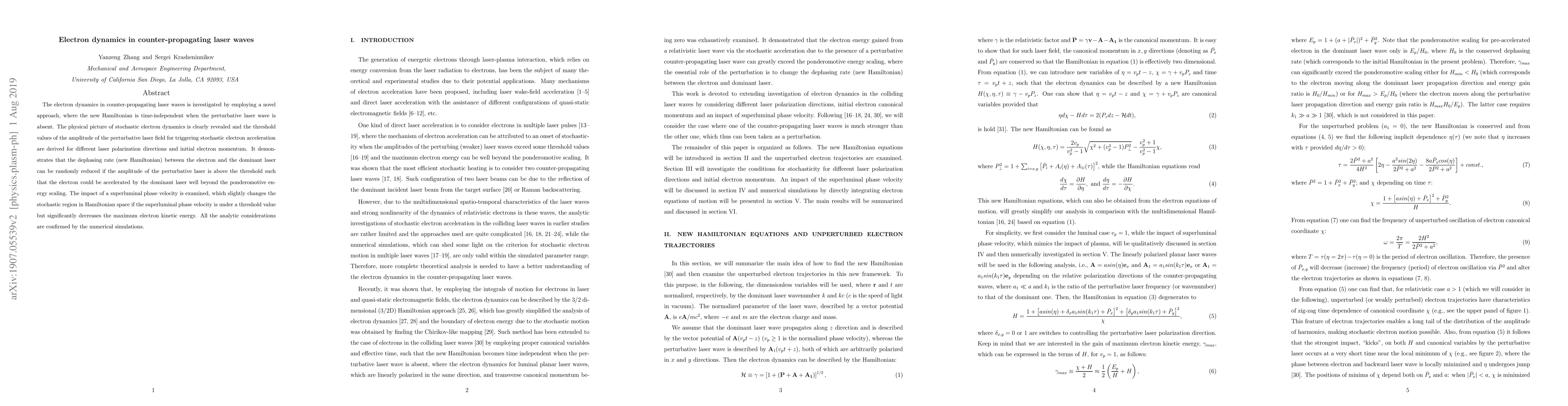 The electron dynamics in counter-propagating laser waves is investigated by employing a novel approach, where the new Hamiltonian is time-independent when the perturbative laser wave is absent. The physical picture of stochastic electron dynamics is clearly revealed and the threshold values of the amplitude of the perturbative laser field for triggering stochastic electron acceleration are derived for different laser polarization directions and initial electron momentum. It demonstrates that the dephasing rate (new Hamiltonian) between the electron and the dominant laser can be randomly reduced if the amplitude of the perturbative laser is above the threshold such that the electron could be accelerated by the dominant laser well beyond the ponderomotive energy scaling. The impact of a superluminal phase velocity is examined, which slightly changes the stochastic region in Hamiltonian space if the superluminal phase velocity is under a threshold value but significantly decreases the maximum electron kinetic energy. All the analytic considerations are confirmed by the numerical simulations.