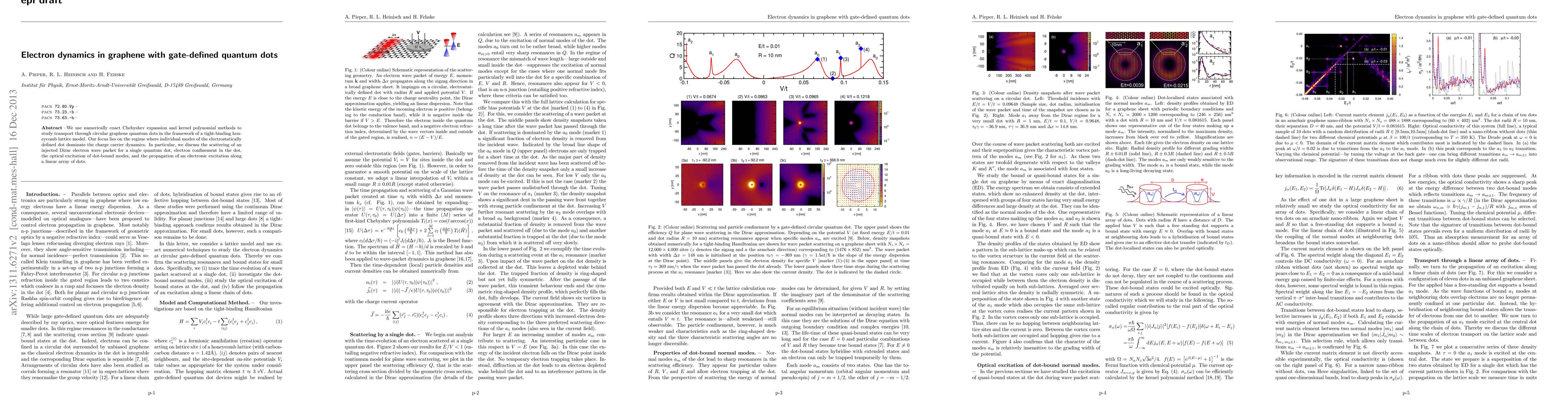 This paper employs advanced numerical methods to study electron dynamics in graphene quantum dots, focusing on individual modes' impact on transport and dynamics, including electron confinement, scattering, optical excitation of dot-bound modes, and excitation propagation through a chain of dots.