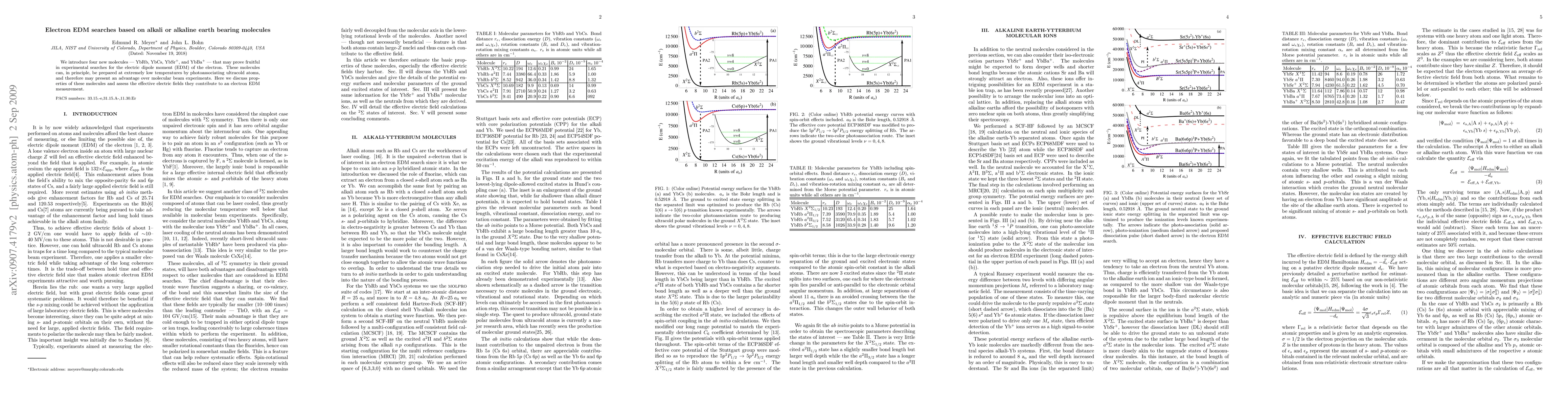 We introduce four new molecules -- YbRb, YbCs, YbSr$^+$, and YbBa$^+$ -- that may prove fruitful in experimental searches for the electric dipole moment (EDM) of the electron. These molecules can, in principle, be prepared at extremely low temperatures by photoassociating ultracold atoms, and therefore may present an advantage over molecular beam experiments. Here we discuss properties of these molecules and assess the effective electric fields they contribute to an electron EDM measurement.
