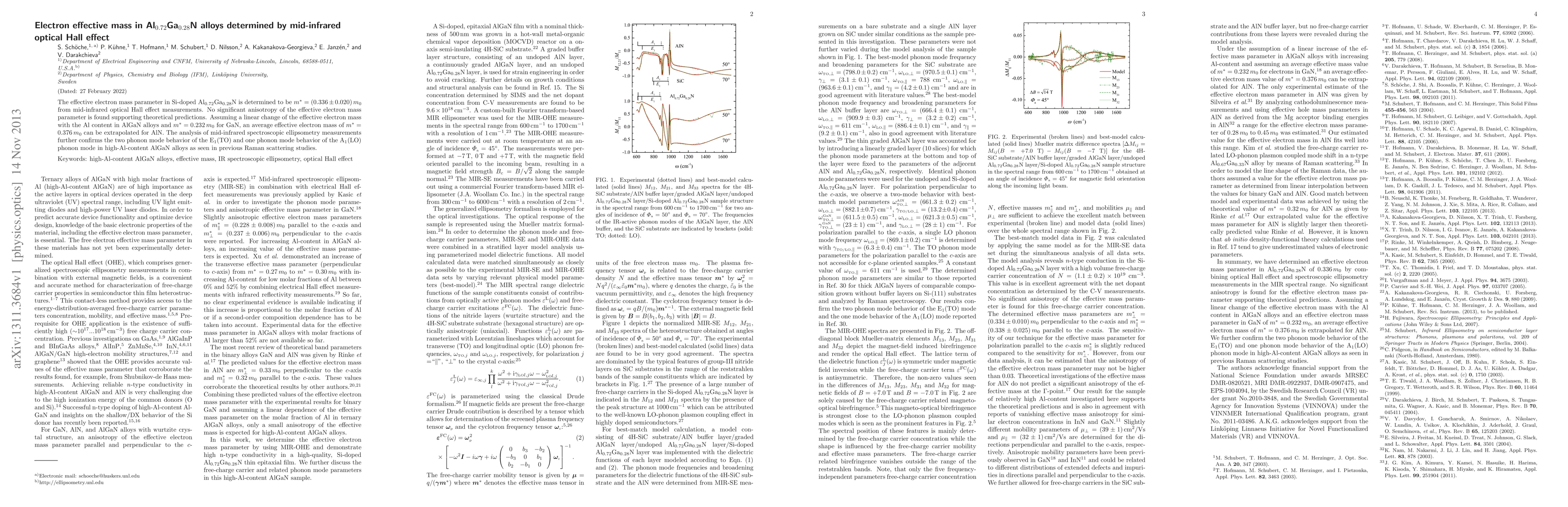 The effective electron mass parameter in Si-doped Al$_{0.72}$Ga$_{0.28}$N is determined to be $m^\ast=(0.336\pm0.020)\,m_0$ from mid-infrared optical Hall effect measurements. No significant anisotropy of the effective electron mass parameter is found supporting theoretical predictions. Assuming a linear change of the effective electron mass with the Al content in AlGaN alloys and $m^\ast=0.232\,m_0$ for GaN, an average effective electron mass of $m^\ast=0.376\,m_0$ can be extrapolated for AlN. The analysis of mid-infrared spectroscopic ellipsometry measurements further confirms the two phonon mode behavior of the E$_1$(TO) and one phonon mode behavior of the A$_1$(LO) phonon mode in high-Al-content AlGaN alloys as seen in previous Raman scattering studies.