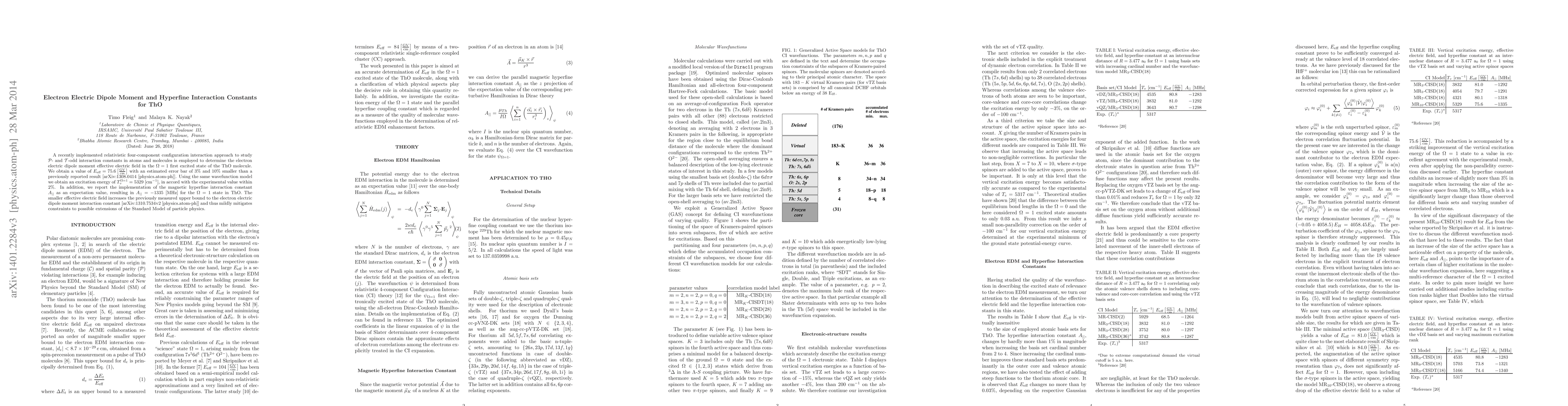 This paper employs a relativistic four-component configuration interaction approach to determine the electron electric dipole moment effective electric field in ThO, yielding $E_{\text{eff}} = 75.6 \left[\frac{\rm GV}{\rm cm}\right]$ with a $3\%$ error. It also reports the magnetic hyperfine interaction constant $A_{||} = -1335$ [MHz] for the $\Omega=1$ state, enhancing constraints on the electron electric dipole moment and potentially impacting extensions of the Standard Model.