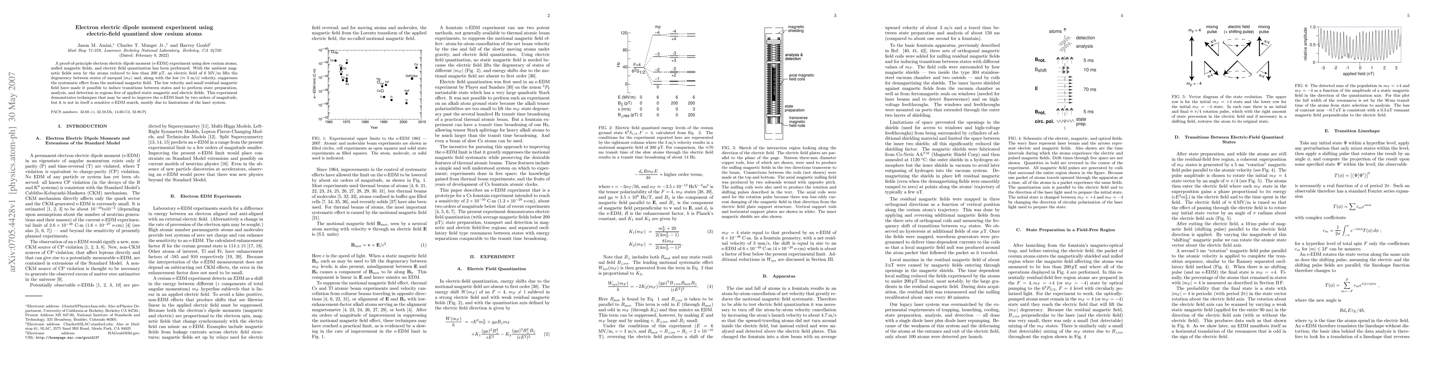 This research demonstrates a proof-of-principle experiment for measuring the electron electric dipole moment using slow cesium atoms in a nulled magnetic field and electric field quantization. The experiment achieves a significant reduction in residual magnetic fields and motional effects, allowing for state preparation and detection without applied static fields, potentially improving the e-EDM limit by two orders of magnitude.