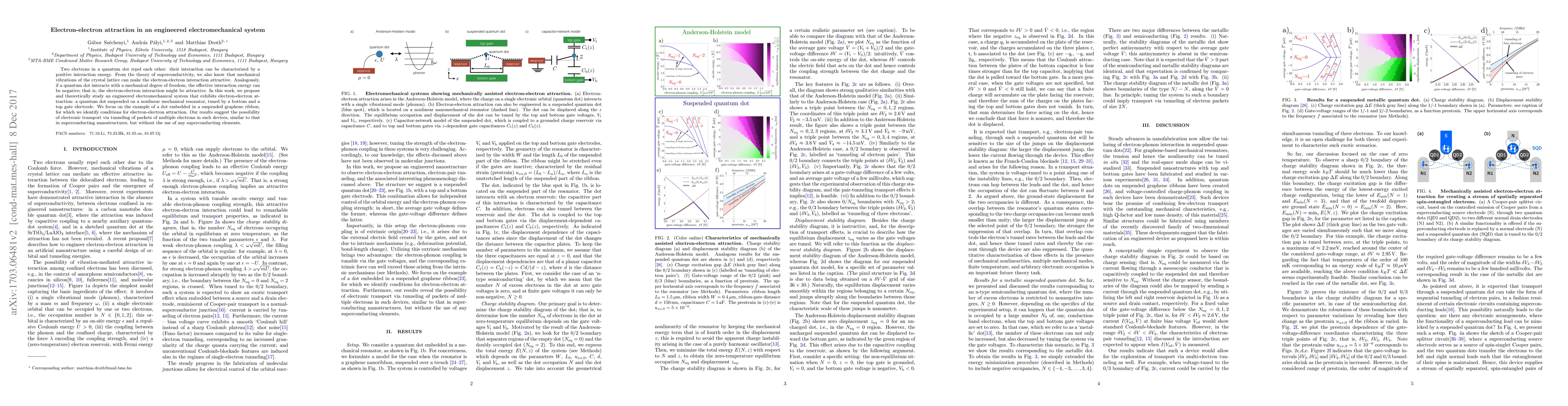 This paper proposes an engineered electromechanical system where a quantum dot on a nonlinear mechanical resonator exhibits electron-electron attraction, achieved by tuning the system with gate electrodes. The study suggests potential for electronic transport via tunneling of multiple electrons, akin to superconductivity, without using superconducting elements.