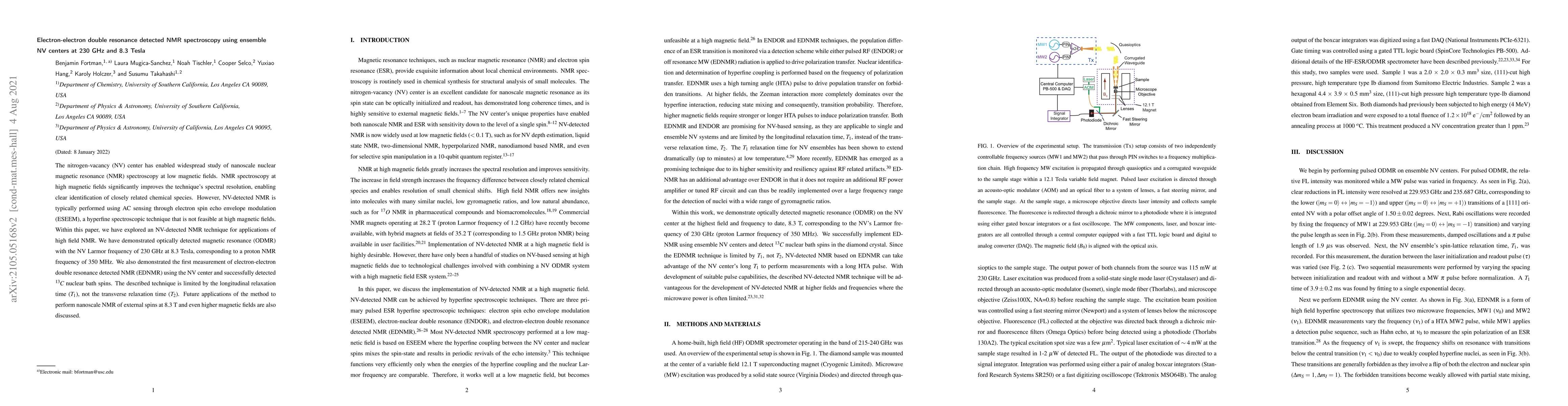 This paper explores an NV-detected NMR technique for high magnetic fields, demonstrating optically detected magnetic resonance (ODMR) at 230 GHz and 8.3 Tesla, and achieving the first electron-electron double resonance detected NMR (EDNMR) using NV centers to detect $^{13}C$ spins. The method is limited by longitudinal relaxation time ($T_1$) rather than transverse relaxation time ($T_2$), with potential for nanoscale NMR applications at higher fields.