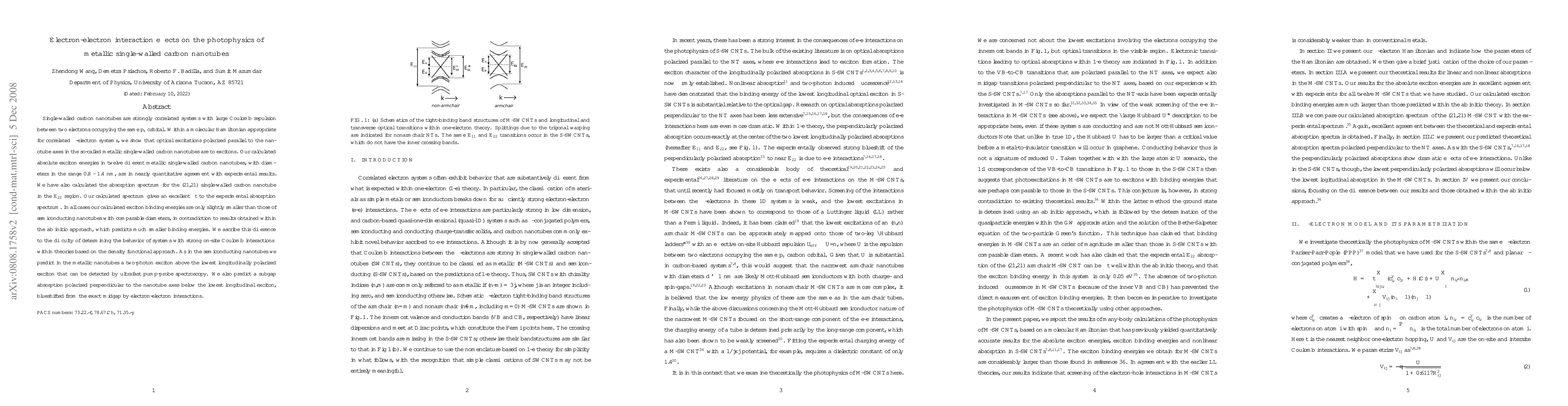 This research investigates electron-electron interaction effects on the photophysics of metallic single-walled carbon nanotubes, showing that optical excitations are primarily excitons with calculated exciton energies matching experimental results. It highlights discrepancies between theoretical predictions and experimental data, attributing differences to challenges in modeling strong Coulomb interactions with density functional theory.