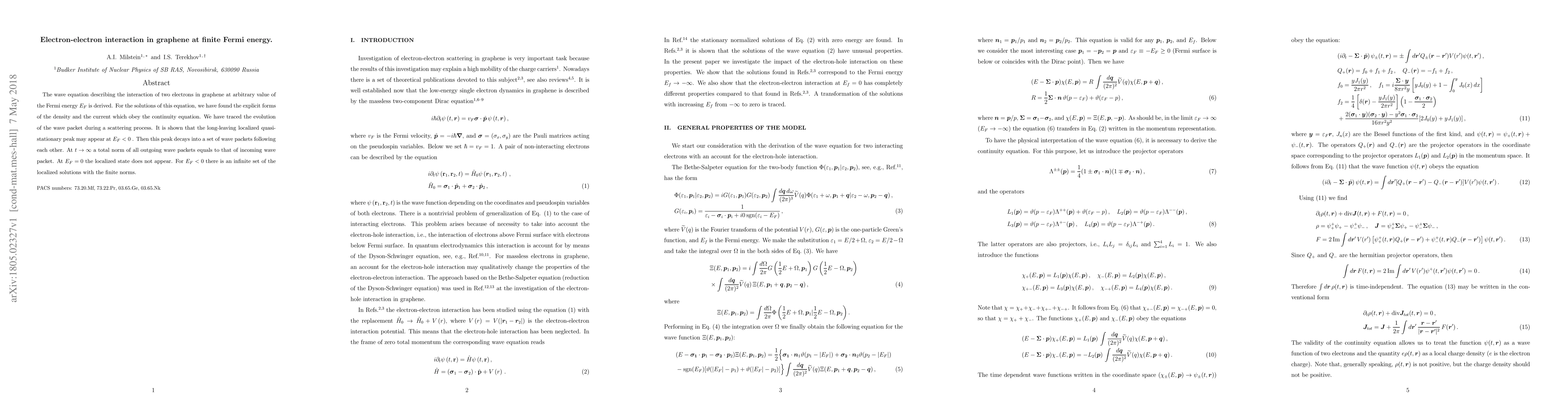 The wave equation describing the interaction of two electrons in graphene at arbitrary value of the Fermi energy $E_F$ is derived. For the solutions of this equation, we have found the explicit forms of the density and the current which obey the continuity equation. We have traced the evolution of the wave packet during a scattering process. It is shown that the long-leaving localized quasi-stationary peak may appear at $E_F<0$ . Then this peak decays into a set of wave packets following each other. At $t\rightarrow\infty$ a total norm of all outgoing wave packets equals to that of incoming wave packet. At $E_F=0$ the localized state does not appear. For $E_F<0$ there is an infinite set of the localized solutions with the finite norms.