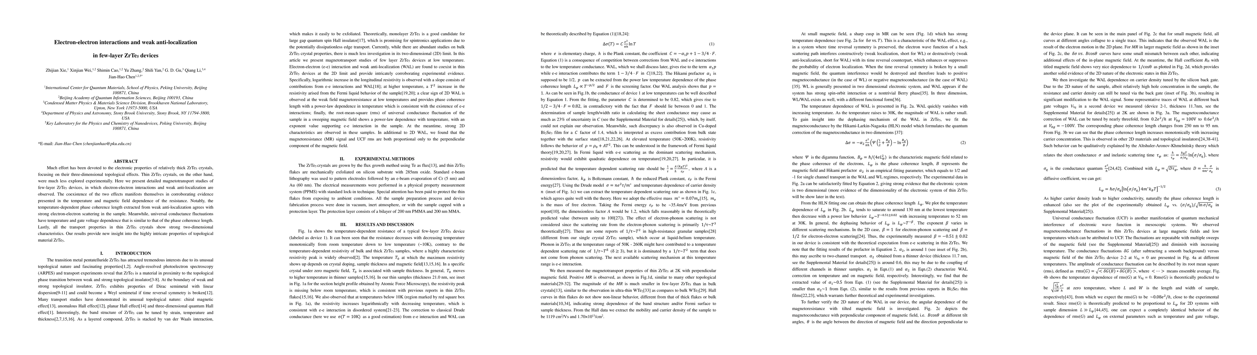 This paper investigates the magnetotransport properties of few-layer ZrTe5 devices, revealing electron-electron interactions and weak anti-localization effects. The study finds that these phenomena are strongly correlated with temperature and magnetic field dependencies, providing new insights into the complex properties of topological material ZrTe5.