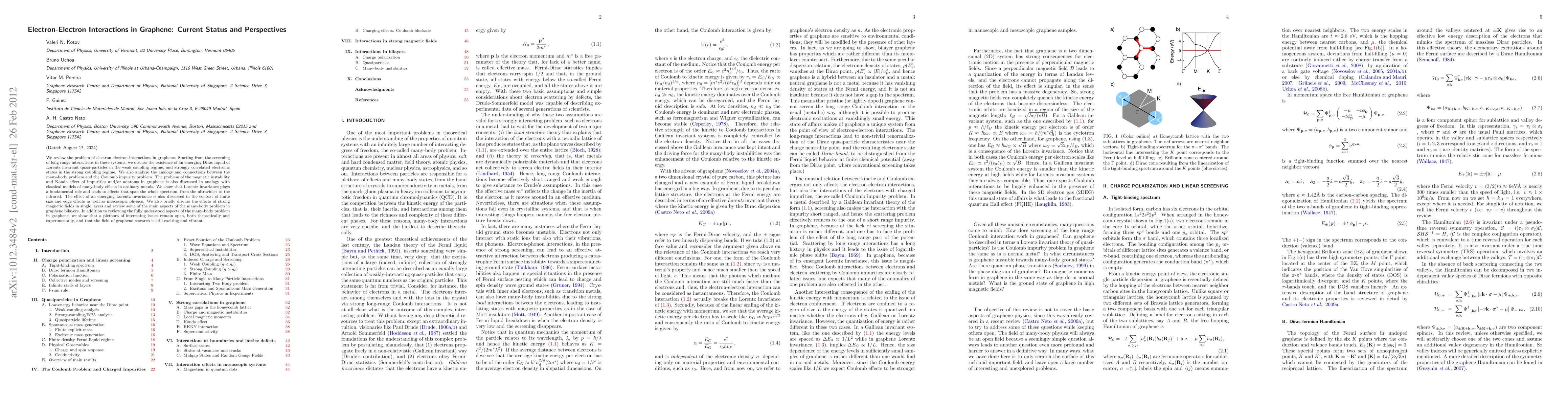 This paper reviews electron-electron interactions in graphene, highlighting the emergence of a Dirac liquid and the transition between weak and strong coupling regimes, while discussing the impact of Lorentz invariance and magnetic instabilities. It also touches on the many-body problem in graphene bilayers and underscores the ongoing theoretical and experimental challenges in the field.