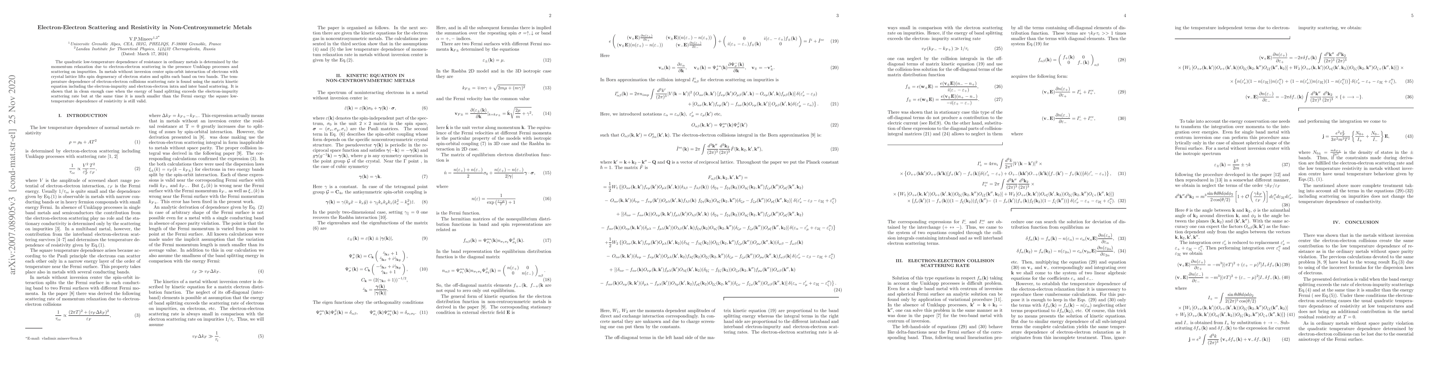 This study investigates electron-electron scattering and its impact on resistivity in non-centrosymmetric metals, revealing a low-temperature quadratic dependence of resistance due to Umklapp processes and impurity scattering. The analysis demonstrates that despite spin-orbit interactions splitting electron bands, the low-temperature resistivity remains quadratic when the band splitting energy is intermediate compared to the Fermi energy.