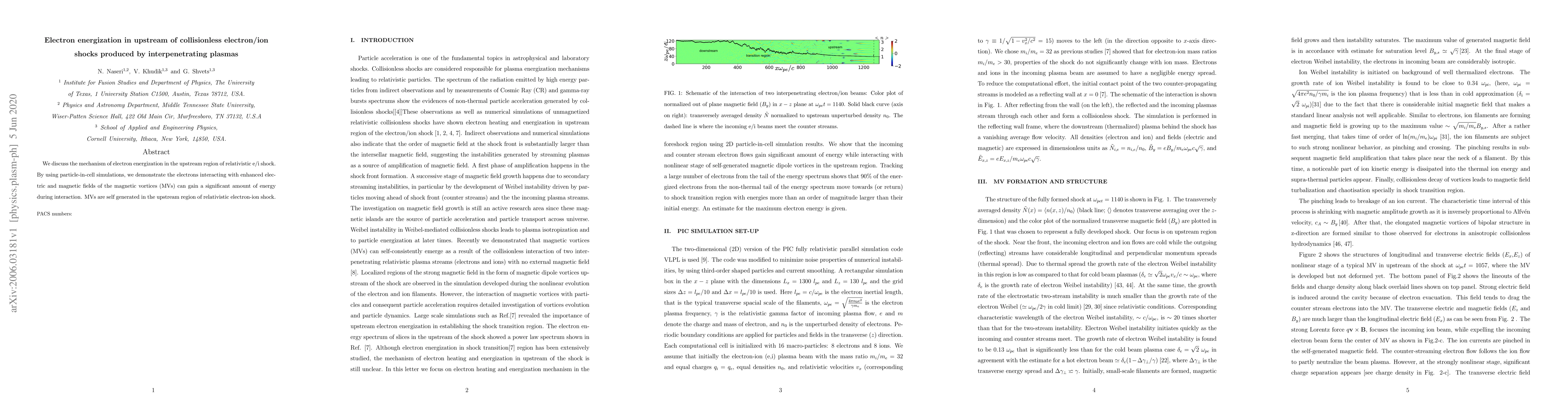 We discuss the mechanism of electron energization in the upstream region of relativistic e/i shock. By using particle-in-cell simulations, we demonstrate the electrons interacting with enhanced electric and magnetic fields of the magnetic vortices (MVs) can gain a significant amount of energy during interaction. MVs are self generated in the upstream region of relativistic electron-ion shock.