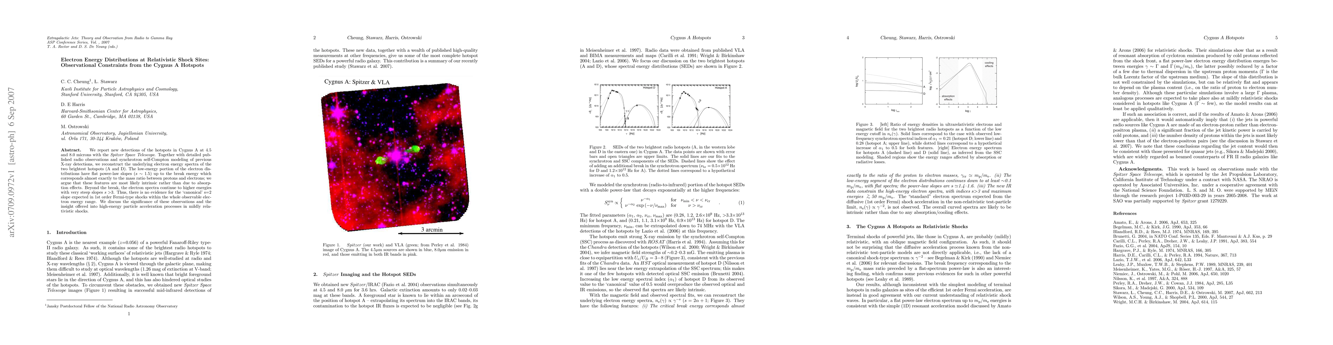 We report new detections of the hotspots in Cygnus A at 4.5 and 8.0 microns with the Spitzer Space Telescope. Together with detailed published radio observations and synchrotron self-Compton modeling of previous X-ray detections, we reconstruct the underlying electron energy spectra of the two brightest hotspots (A and D). The low-energy portion of the electron distributions have flat power-law slopes (s~1.5) up to the break energy which corresponds almost exactly to the mass ratio between protons and electrons; we argue that these features are most likely intrinsic rather than due to absorption effects. Beyond the break, the electron spectra continue to higher energies with very steep slopes s>3. Thus, there is no evidence for the `canonical' s=2 slope expected in 1st order Fermi-type shocks within the whole observable electron energy range. We discuss the significance of these observations and the insight offered into high-energy particle acceleration processes in mildly relativistic shocks.
