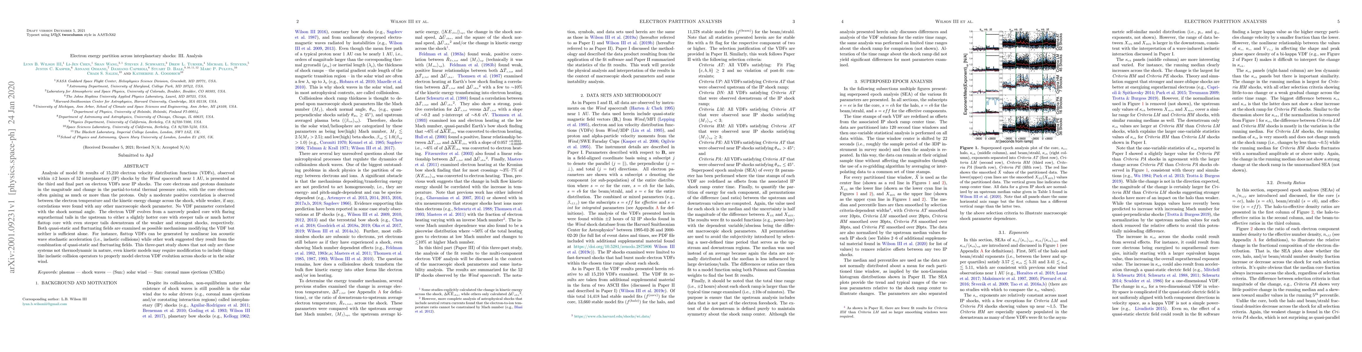Analysis of model fit results of 15,210 electron velocity distribution functions (VDFs), observed within $\pm$2 hours of 52 interplanetary (IP) shocks by the Wind spacecraft near 1 AU, is presented as the third and final part on electron VDFs near IP shocks. The core electrons and protons dominate in the magnitude and change in the partial-to-total thermal pressure ratio, with the core electrons often gaining as much or more than the protons. Only a moderate positive correlation is observed between the electron temperature and the kinetic energy change across the shock, while weaker, if any, correlations were found with any other macroscopic shock parameter. No VDF parameter correlated with the shock normal angle. The electron VDF evolves from a narrowly peaked core with flaring suprathermal tails in the upstream to either a slightly hotter core with steeper tails or much hotter flattop core with even steeper tails downstream of the weaker and strongest shocks, respectively. Both quasi-static and fluctuating fields are examined as possible mechanisms modifying the VDF but neither is sufficient alone. For instance, flattop VDFs can be generated by nonlinear ion acoustic wave stochastic acceleration (i.e., inelastic collisions) while other work suggested they result from the combination of quasi-static and fluctuating fields. This three-part study shows that not only are these systems not thermodynamic in nature, even kinetic models may require modification to include things like inelastic collision operators to properly model electron VDF evolution across shocks or in the solar wind.