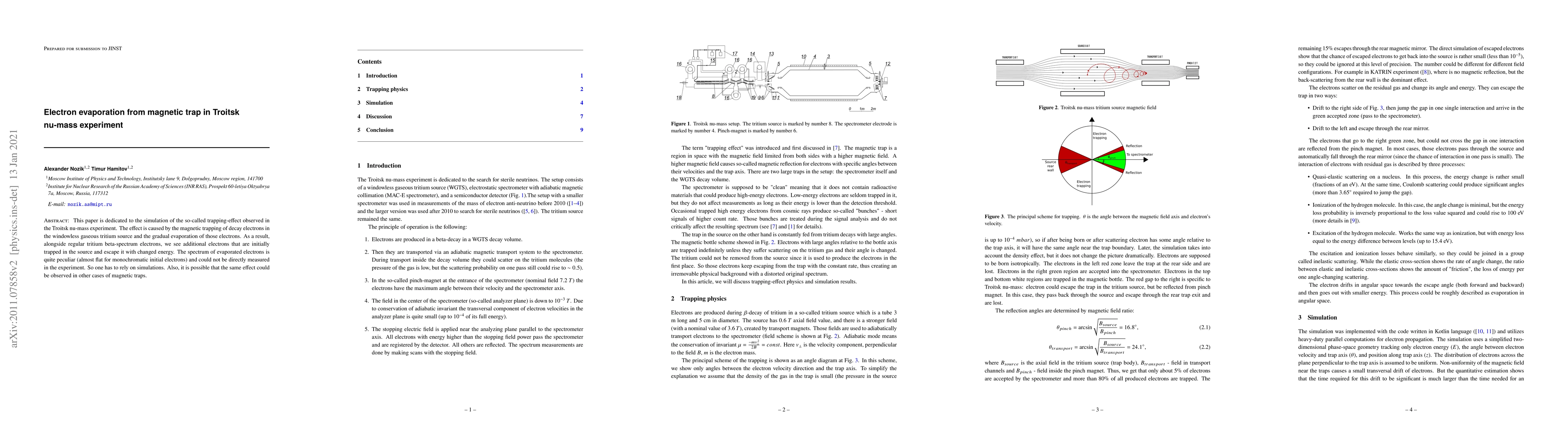 This paper is dedicated to the simulation of the so-called trapping-effect observed in the Troitsk nu-mass experiment. The effect is caused by the magnetic trapping of decay electrons in the windowless gaseous tritium source and the gradual evaporation of those electrons. As a result, alongside regular tritium beta-spectrum electrons, we see additional electrons that are initially trapped in the source and escape it with changed energy. The spectrum of evaporated electrons is quite peculiar (almost flat for monochromatic initial electrons) and could not be directly measured in the experiment. So one has to rely on simulations. Also, it is possible that the same effect could be observed in other cases of magnetic traps.