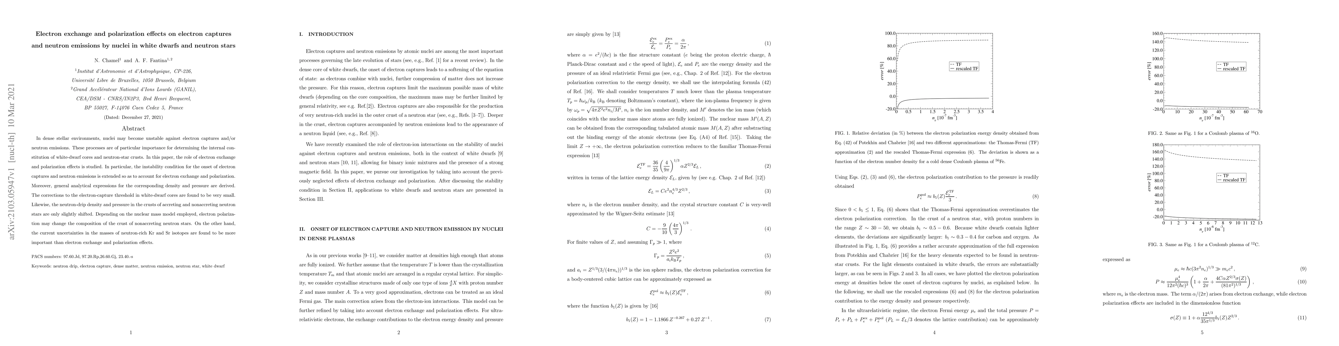 This paper investigates electron exchange and polarization effects on electron captures and neutron emissions in white dwarfs and neutron stars, finding minor corrections to thresholds and densities but significant uncertainties due to nuclear mass models.