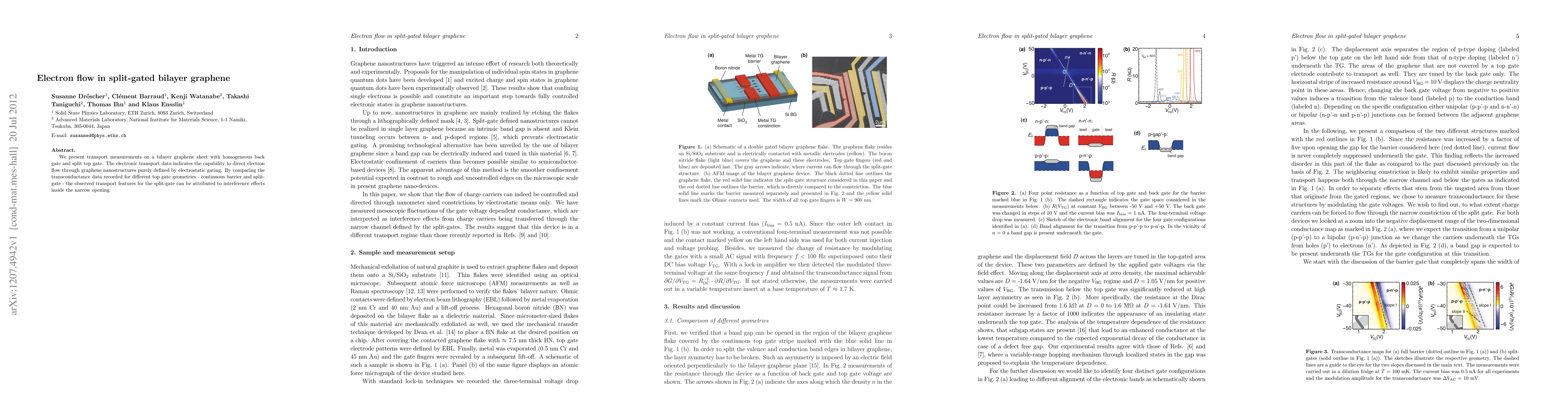 This study investigates electron flow in bilayer graphene using a split-gated configuration, demonstrating the ability to control electron transport via electrostatic gating. The observed transport features in split-gate geometries are attributed to interference effects within the narrow opening.