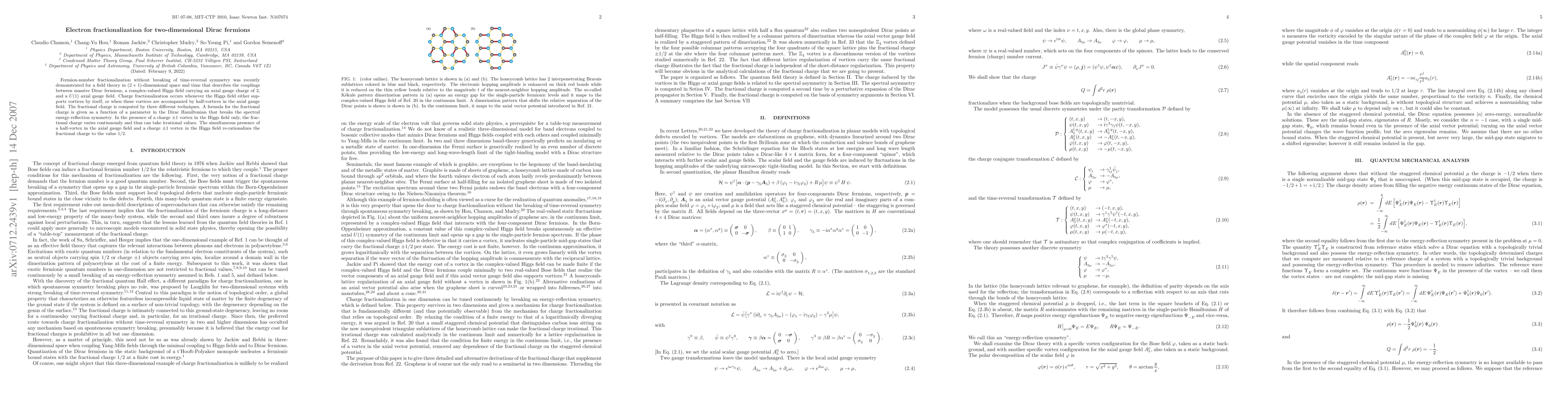 The paper presents a detailed analysis of electron fractionalization using spectral asymmetry, perturbative methods, and axial flux, providing a comprehensive understanding of fractional charges in Dirac fermions.