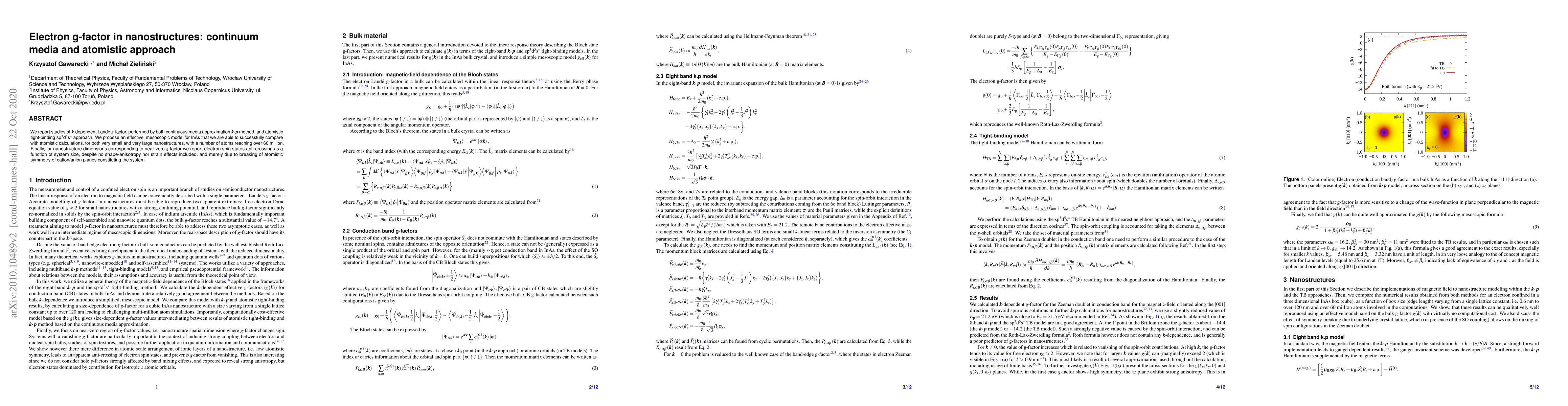 The research presents a comparative study of the electron g-factor in nanostructures using both continuous media approximation and atomistic tight-binding methods. An effective mesoscopic model for InAs is proposed, successfully aligned with atomistic calculations for various nanostructure sizes. The study reveals electron spin states anti-crossing near zero g-factor, caused by broken atomistic symmetry, without shape-anisotropy or strain effects.